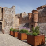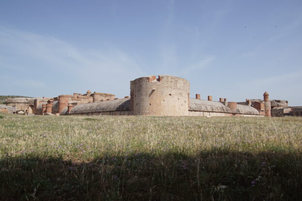 J13 au Nord de Perpignan : jeudi 16 Juin 2022, arrivée à la Forteresse de Salses*** vers 10h40 après 25km/25mn de routes de campagne par la côte et le Barcarès. Le soleil tape déjà et heureusement il reste 1 place de stationnement à l’ombre des arbres contre la voie ferrée.