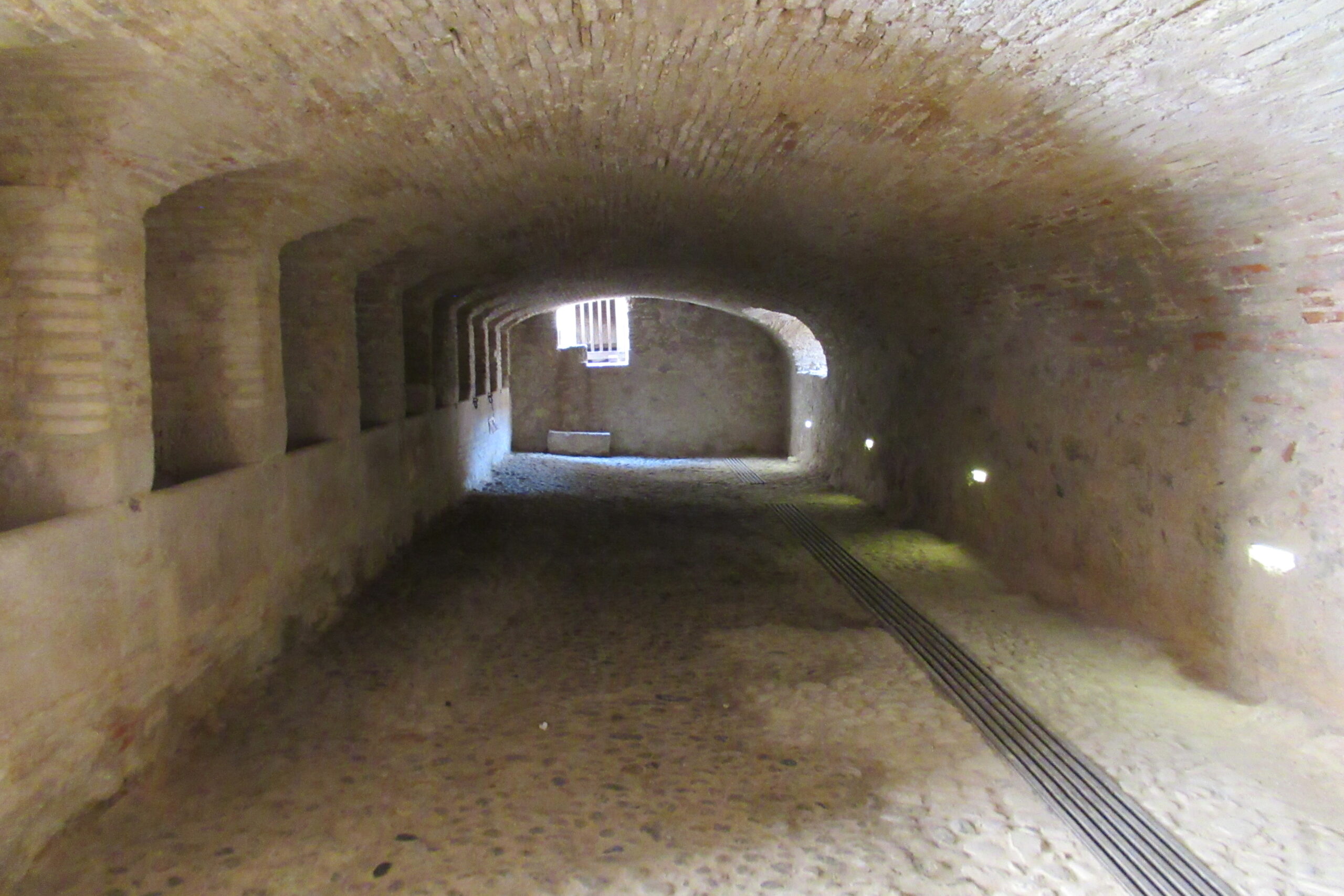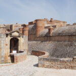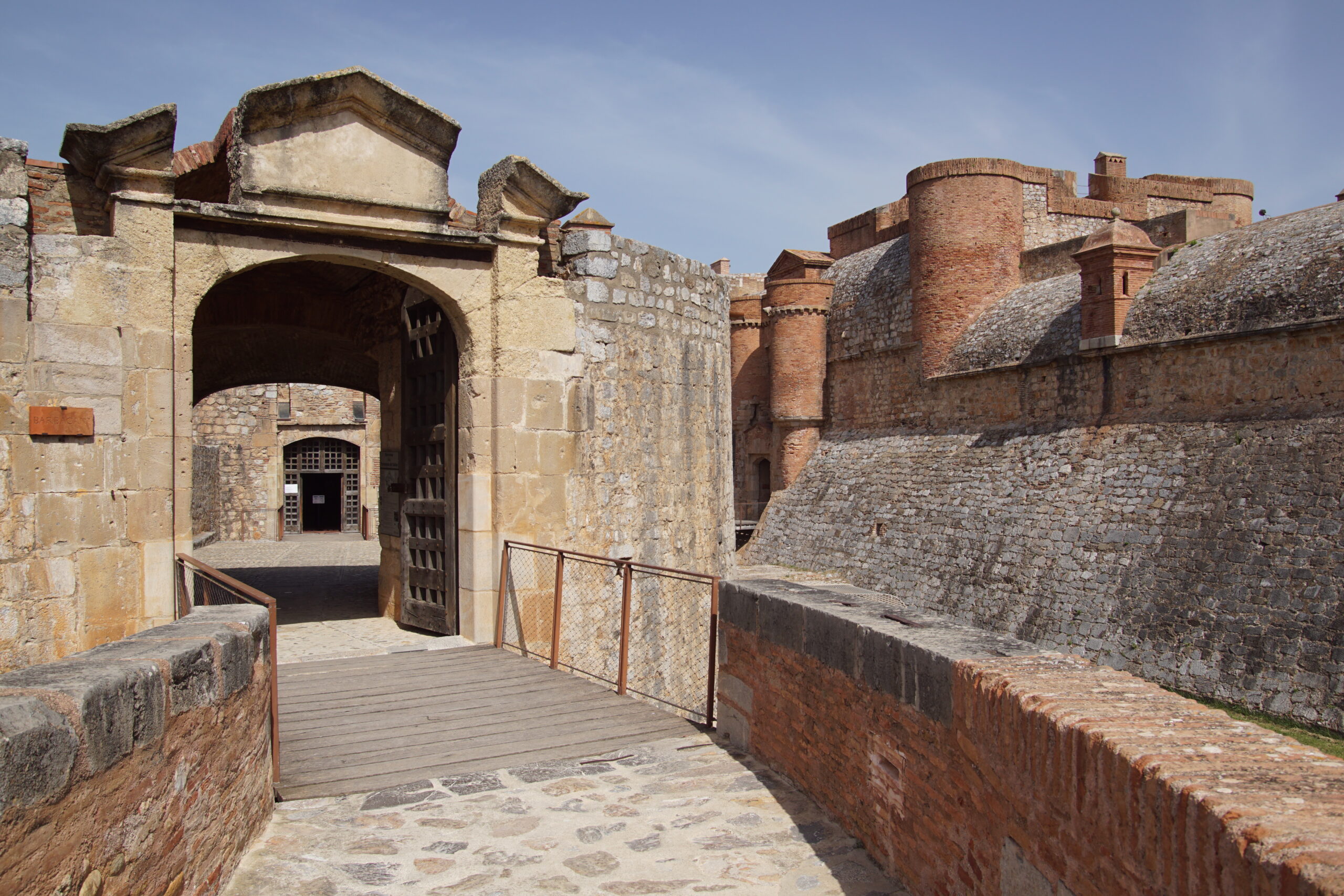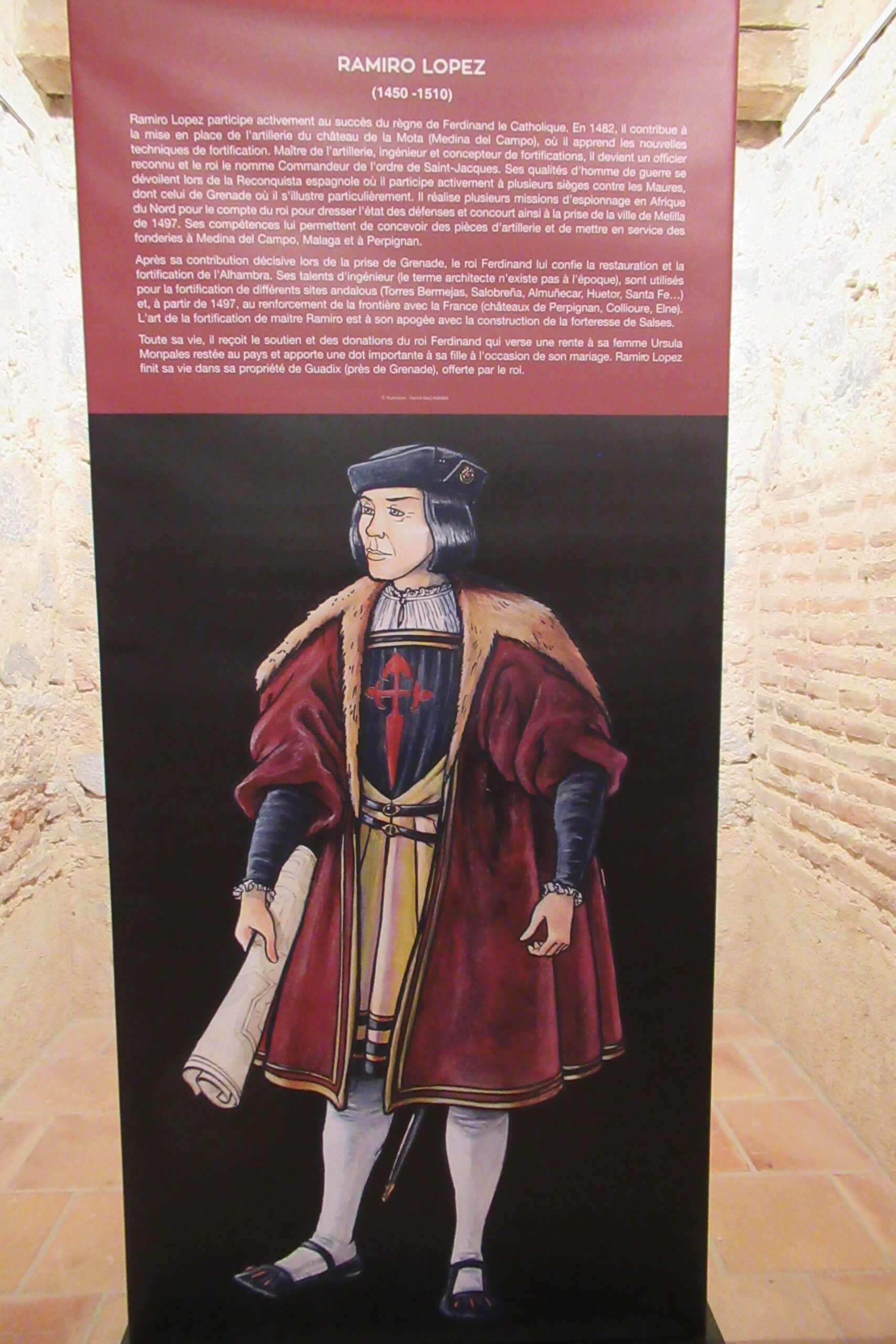 • Quelques photos depuis l’extérieur de cet imposant ensemble semi-enterré (photo ci-dessus). Ce « château des Rois catholiques Espagnols » a été construit vers l’an 1500. L’architecte Ramiro Lopez en fut l’artisan (après avoir rénové l’Alhambra de Grenade…), mandaté par le roi Ferdinand. Il est à ce jour, dans un état remarquable. Notre Vauban s’en est largement inspiré… Nous y entrons pour 8€ en CB/pers. et l’on nous propose de suite de suivre la visite guidée (sans supplément) à 11h00.