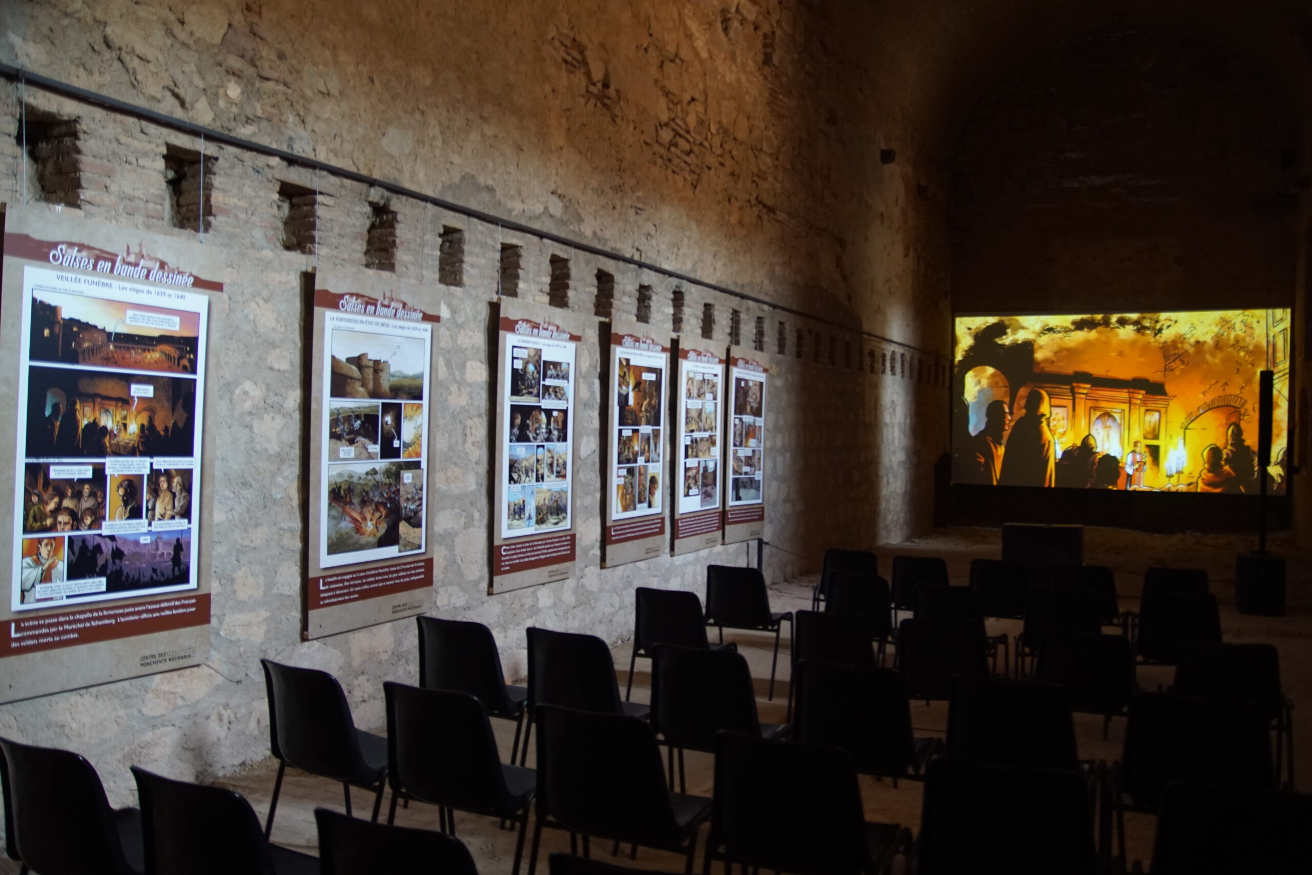 • Suivent 45mn d’explications et anecdotes par une sympathique guide, pour notre petit groupe de 12/15 personnes. Ensuite nous déambulons librement à travers les salles, escaliers, coursives, les écuries souterraines, la chapelle. Une salle de projection et une autre avec des jeux anciens. Un très bel ensemble dont la visite est « obligatoire ».