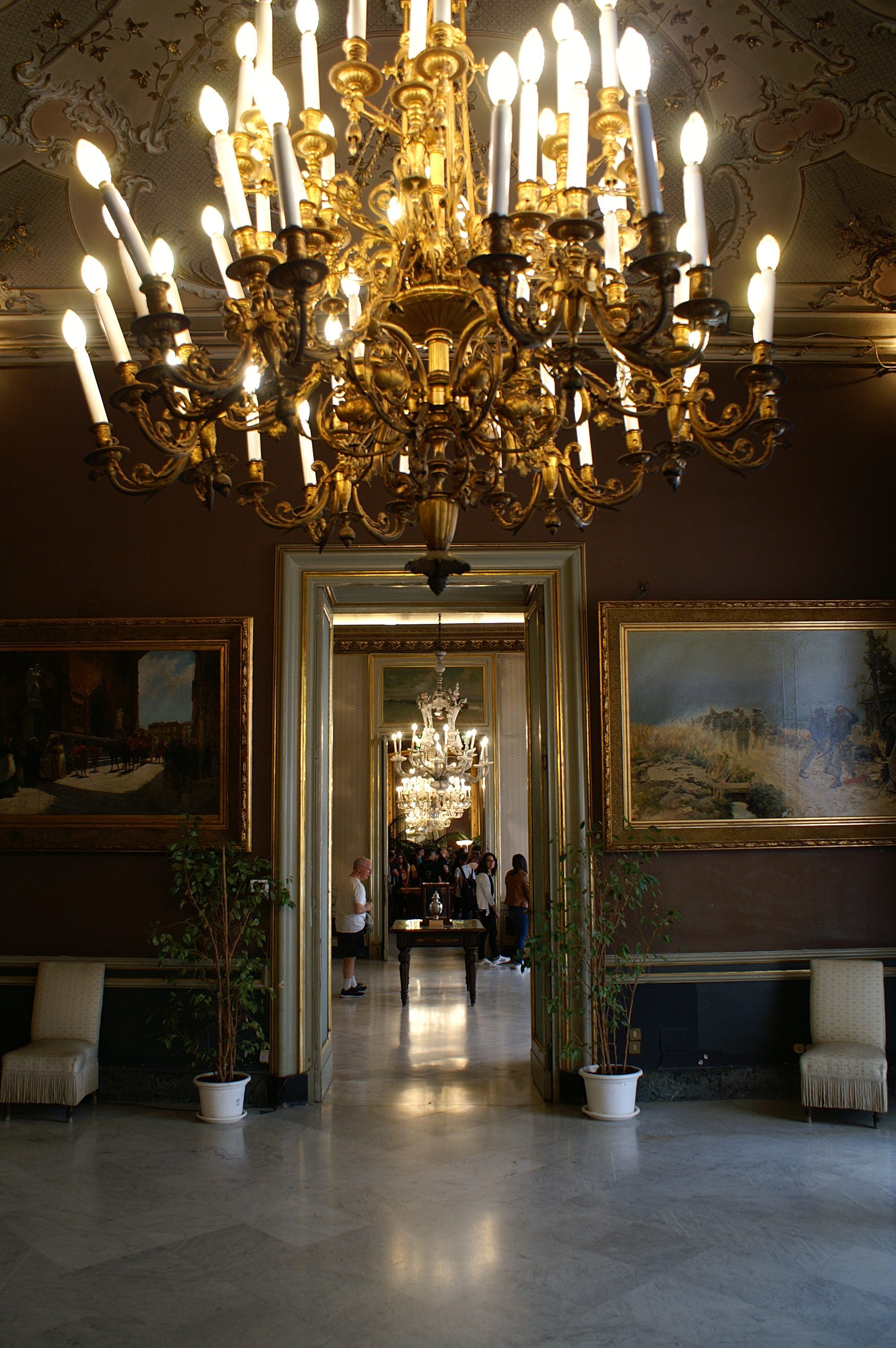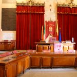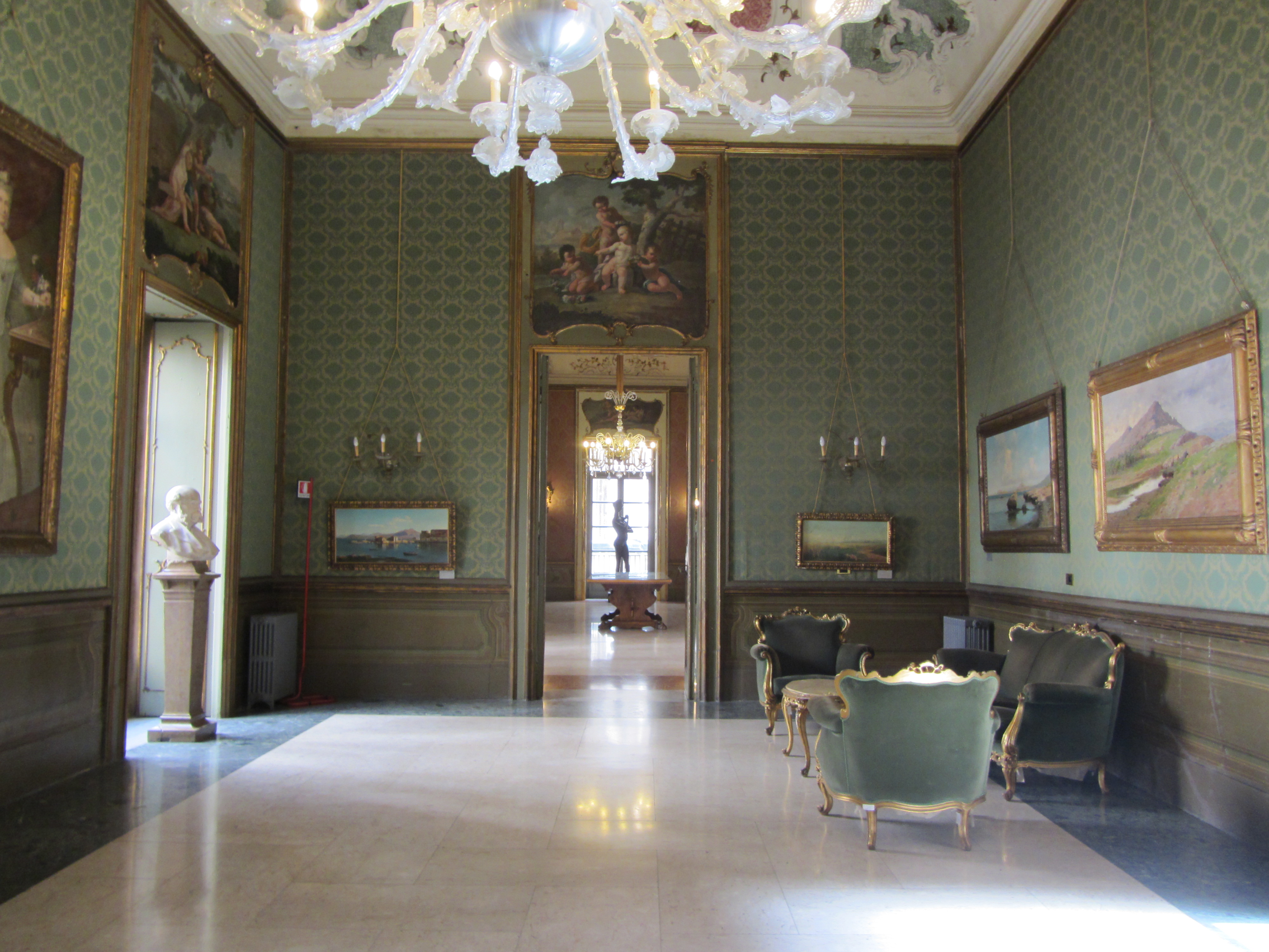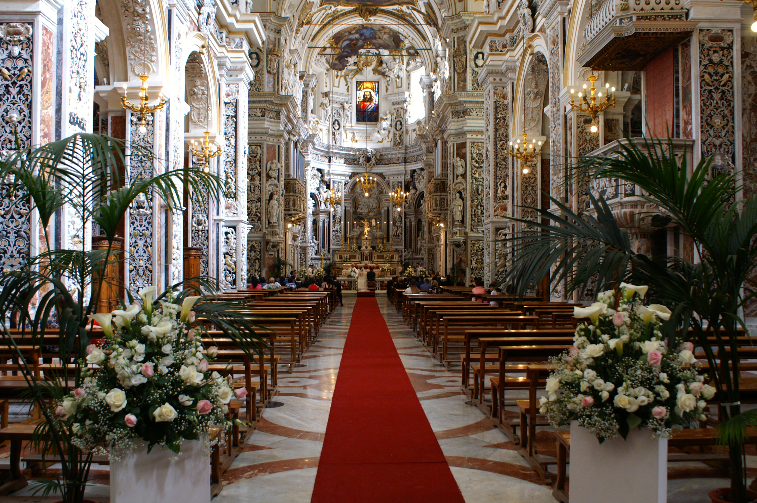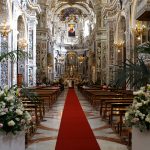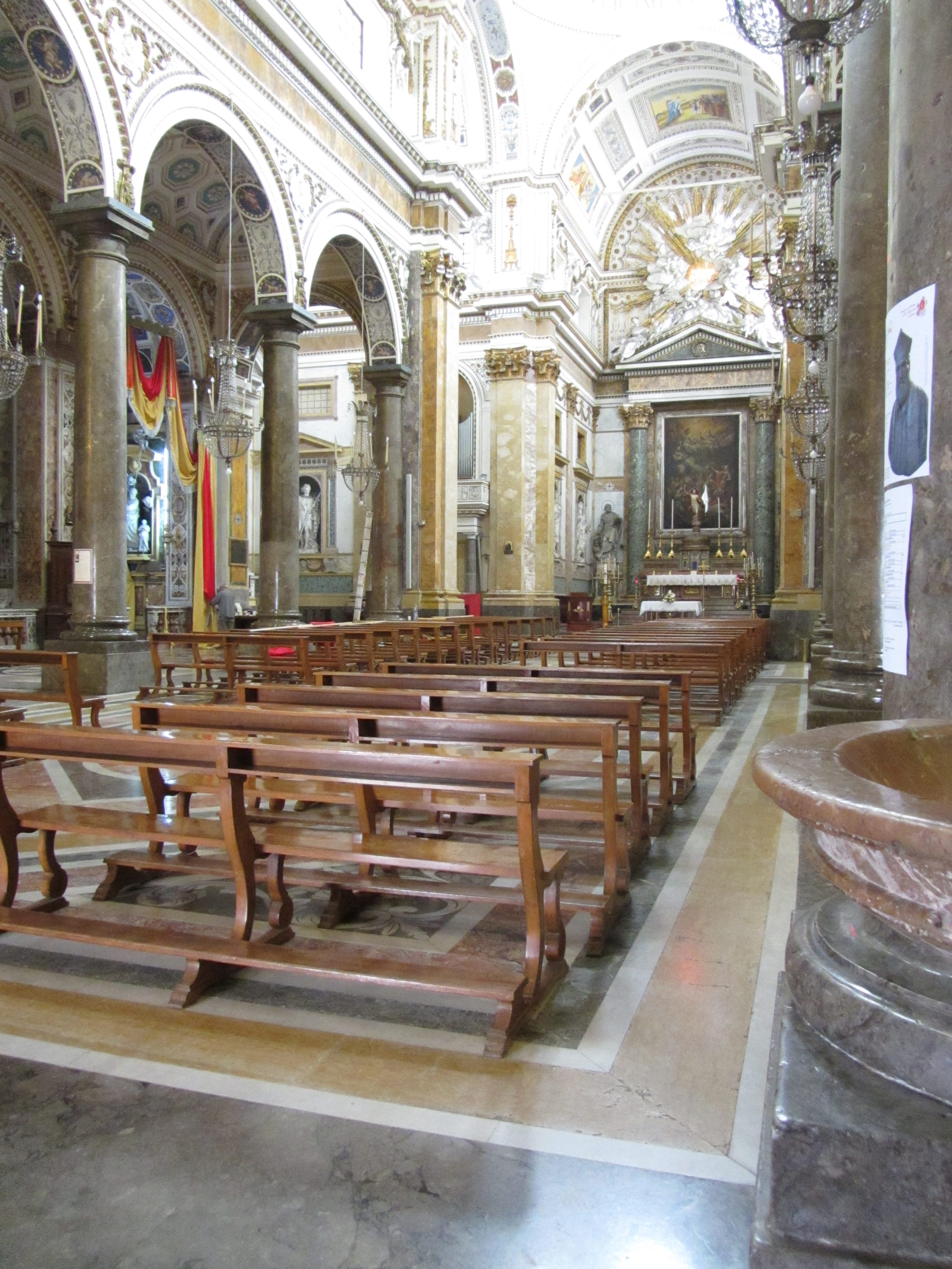 - C’est reparti pour la visite gratuite (au pas de charge pour nous 3 et le bénévole de service) du Palazzo Comitini*, bien meublé, lustres de Murano, assiettes décorées insérées dans les murs (un peu étrange…). Pas très loin la Chiesa Del Gesù*** (entrée gratuite car il y a un mariage), magnifique avec ses décors en marbre blanc, à voir), puis la piazza Bologni*.