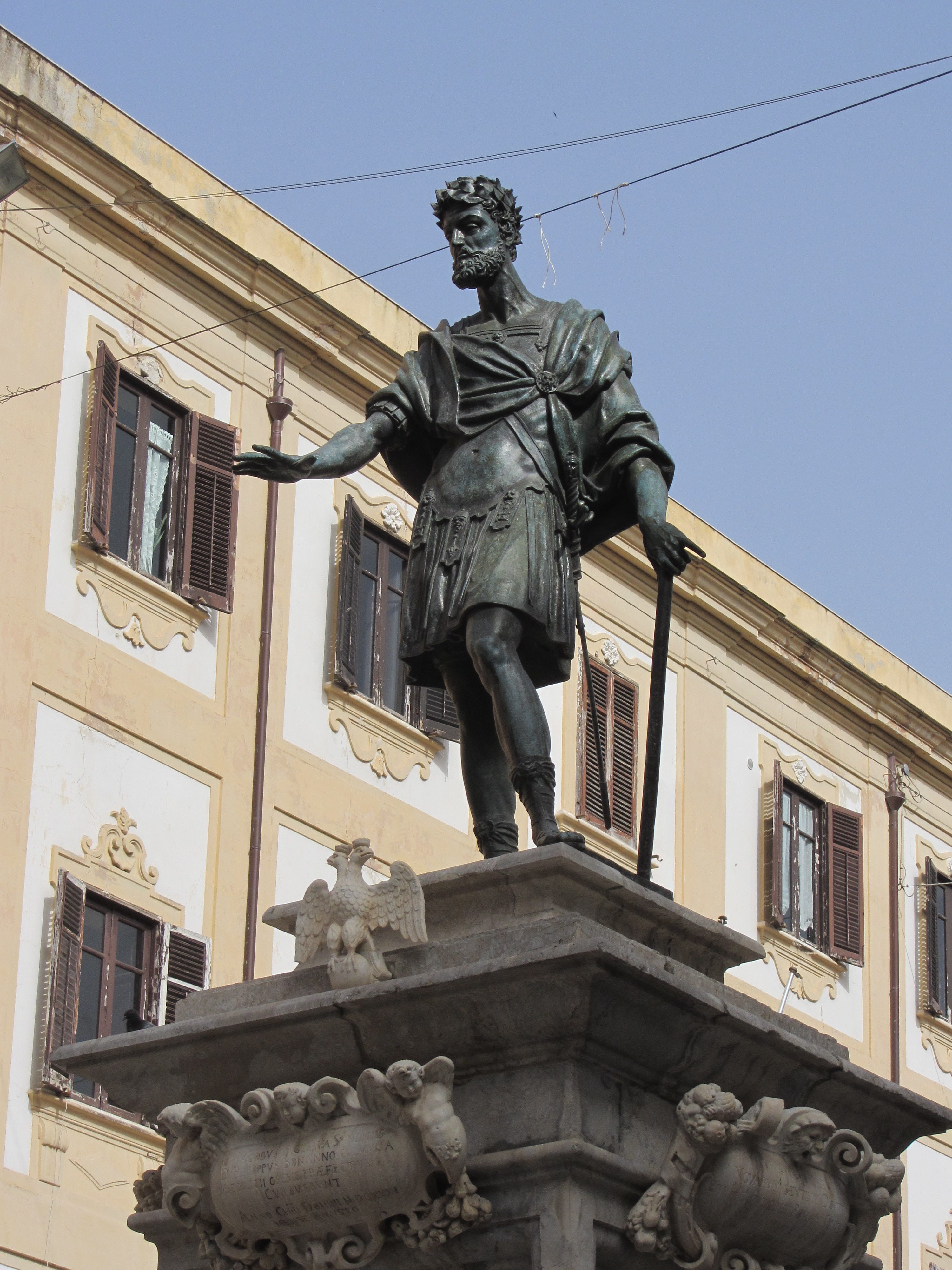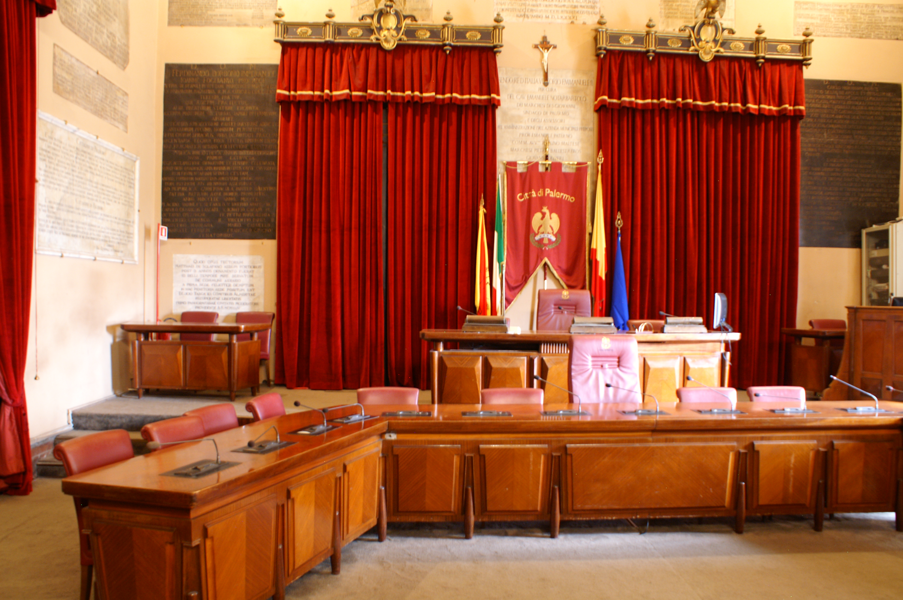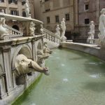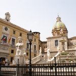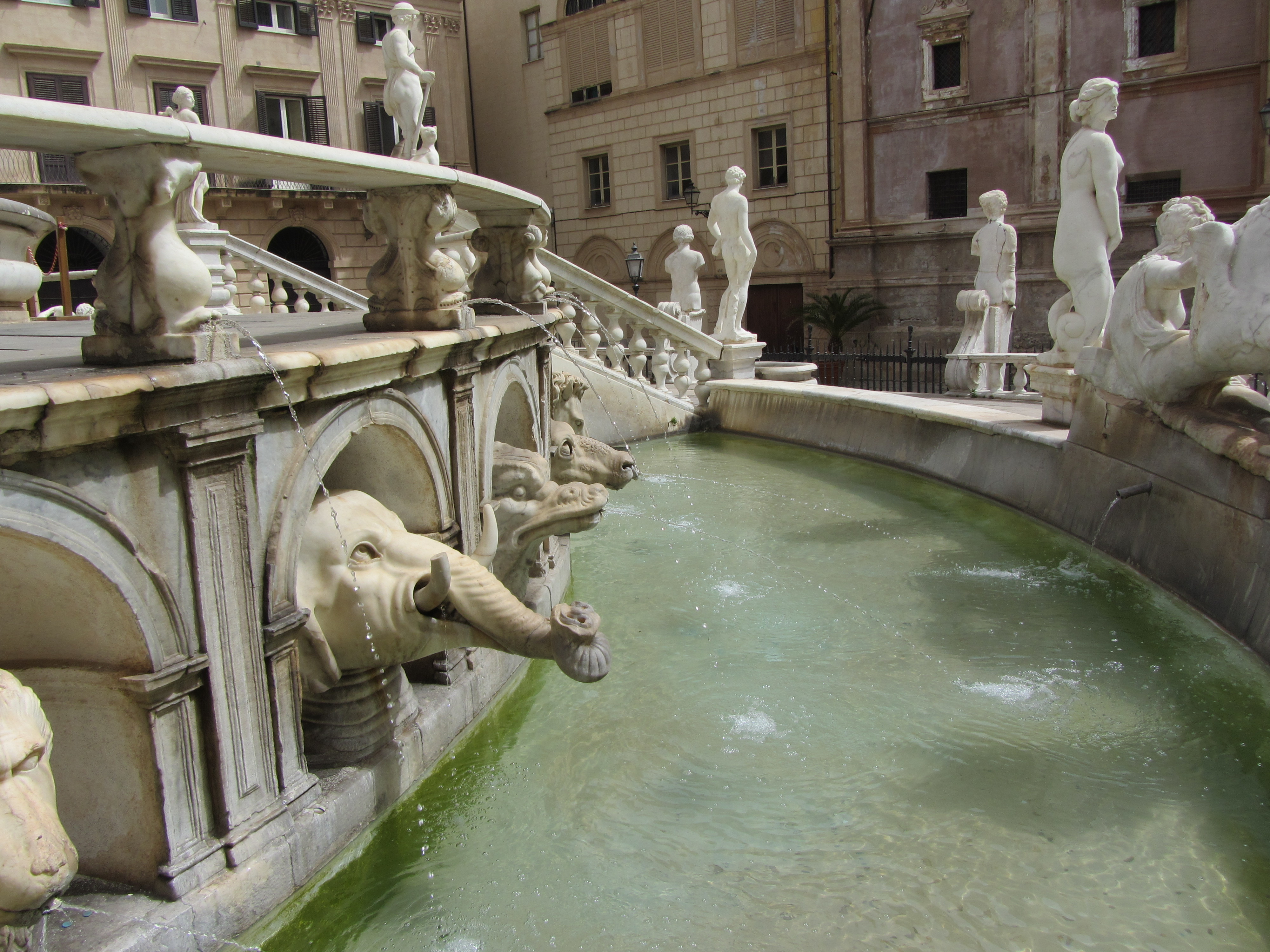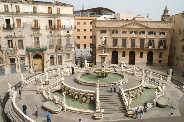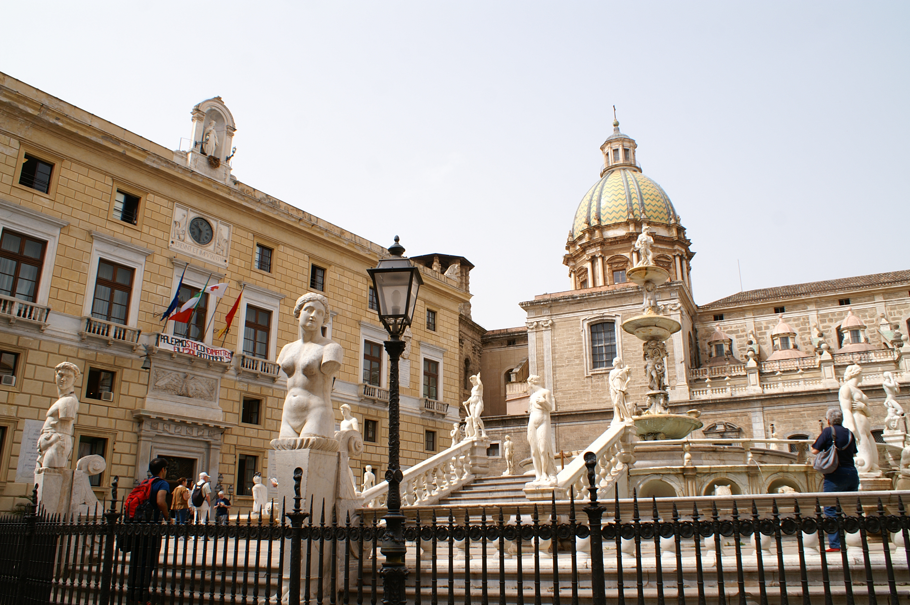 - Nous continuons vers la plazza Vigliena** qui est au croisement de la via Vittorio Emanuelle et de la via Maqueda donc, si vous suivez ce sont les « Quattro Canti » (point de rendez vous incontournable). Juste à 100m, monter les escaliers vers la fontaine de la honte*** (ils sont nus…) de la piazza Pretoria**, entrer dans la mairie (Palazzo Pretorio*, gratuit, belles salles à l’étage).