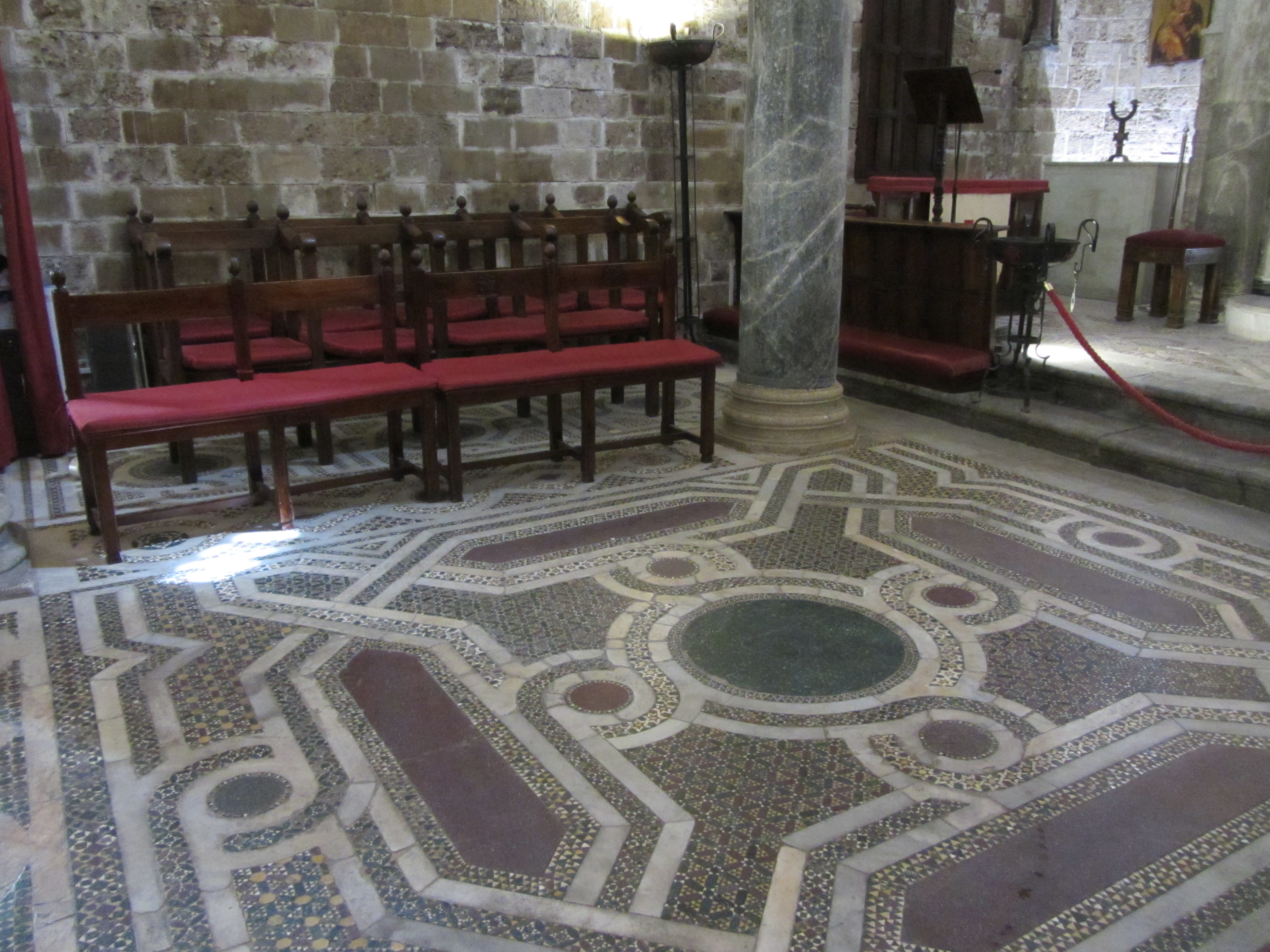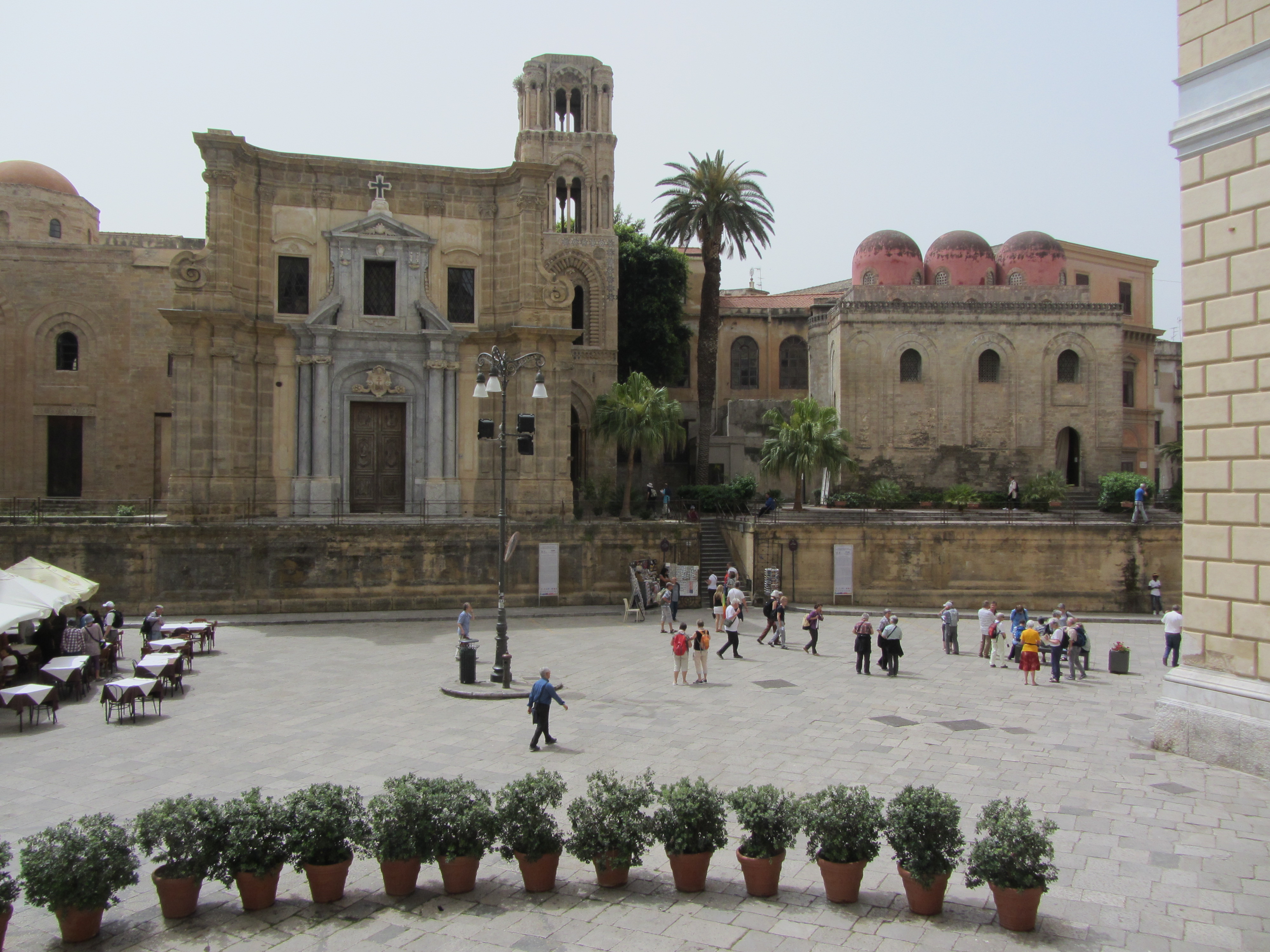 - Un peu plus loin la piazza Bellini** avec 3 points de visite: San Cataldo* avec ses coupoles rouges (c’est une seule pièce sobre, chapelle du 12ème), Santa Maria dell Amiraglio dite La Martorana** (billet groupé avec la précédente 3€- dorures à foison), Chiesa Santa Caterina d’Alessandria** (2€- du marbre de toutes couleurs). Passage par le marché du Ballaro* (couleurs et odeurs) pour quelques courses alimentaires pas chères du tout, et repas à l’appartement + pause.