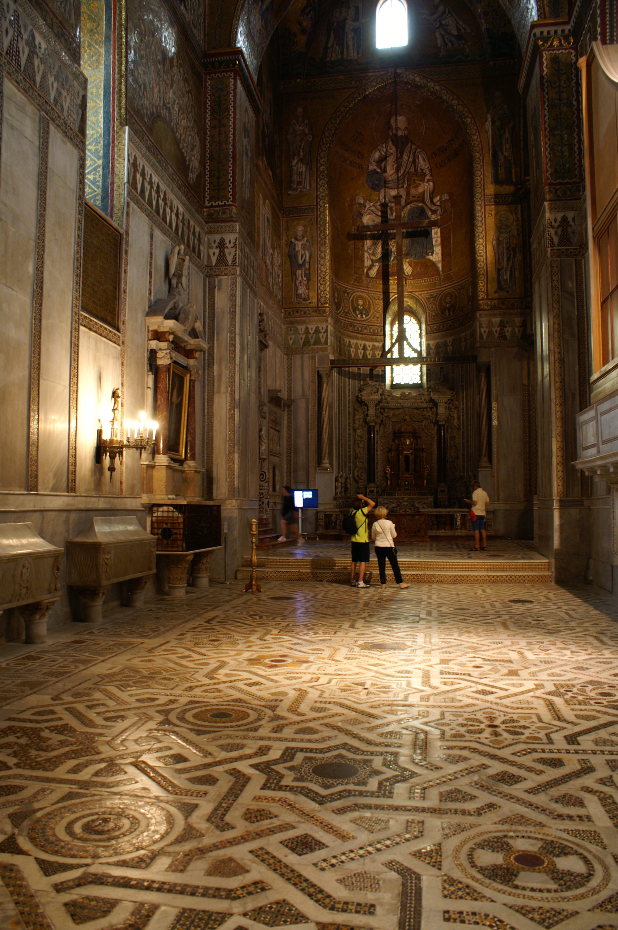 - 30mn après, prendre à pieds la route directe (à droite) à travers la ville pour atteindre la place du Duomo**: nous entrons dans la cathédrale (gratuite) pour filer au fond, à droite et monter aux terrasses*** (billet groupé 4€ cash avec le trésor). Parcours ludique dominant le site. Puis traversée en diagonale pour accéder au trésor** (beau pavage).