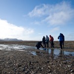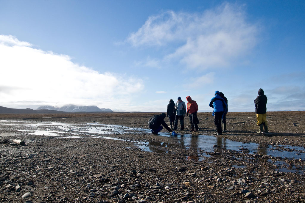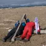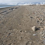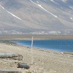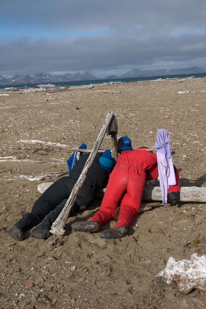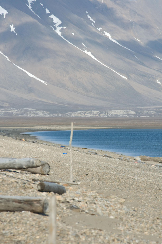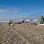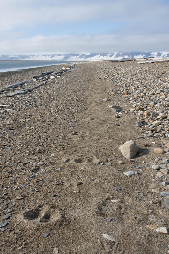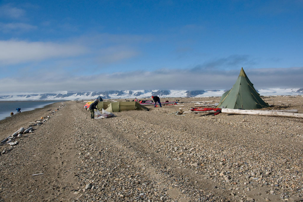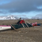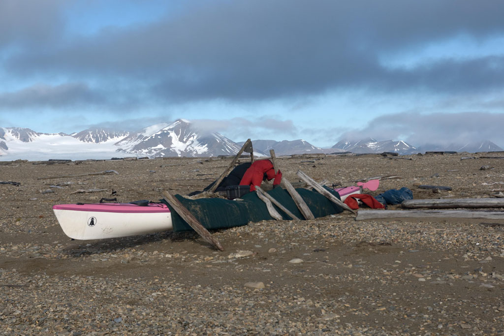 Les autres kayaks arrivent sans problèmes et nous pouvons enfin passer des vêtements secs. Nous resterons là cette « nuit » (il est 7h30 du matin), le temps de reprendre nos esprits. En attendant, la première chose à faire est d’aller chercher de l’eau. Nous remontons donc la plage vers les montagnes sur quelques centaines de mètres quand Jean-Christophe repère une tâche blanche dans le paysage. Bien sûr, pour une fois, nous n’avons pas les jumelles, donc impossible de vérifier la nature de cette tâche. Mais il n’y a pas de rochers blancs autour de nous, c’est trop gros et trop clair pour être un renne, et trop loin du rivage pour être un déchet quelconque… donc hypothèse plausible : un ours endormi ! Nous prenons l’eau rapidement et repartons vers les kayaks par un chemin détourné et en marchant dans l’eau (afin que la « tâche », si elle se réveille, ne suive pas notre odeur jusqu’au camp). Je ne peux pas m’empêcher de me retourner toutes les 30 secondes pour vérifier… mais la « tâche » ne bouge pas.