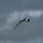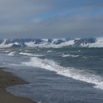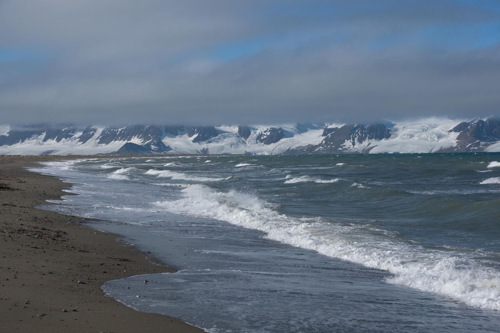 Peu à peu, la brume se lève et nous laisse découvrir la chaîne montagneuse et les glaciers du Prins Karls Forland (l’île qui longe la côté ouest du Spitzberg juste au sud de la baie du Roi). Malheureusement, le vent se lève aussi, et évidemment les vagues se forment. Elles nous arrivent dessus par l’arrière droit et nous poussent. De fait, pendant un moment, nous avançons à bonne allure vers notre objectif, la pointe de Sarstangen (qui est parfois occupée par une colonie de morses).