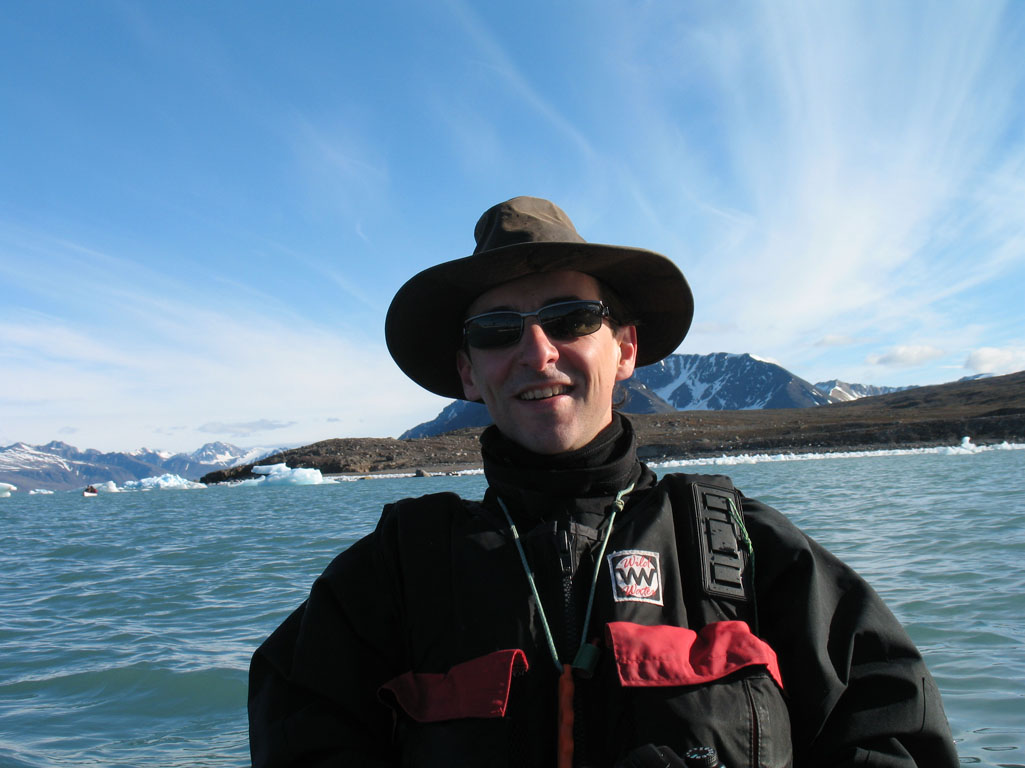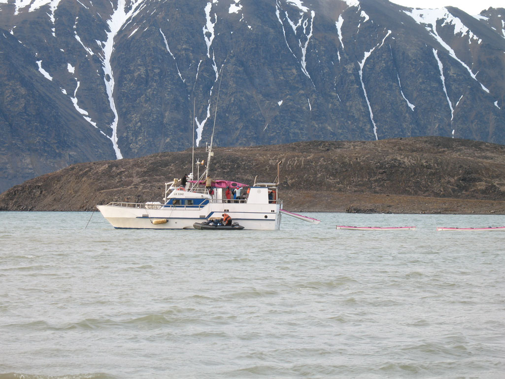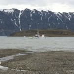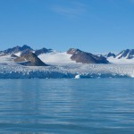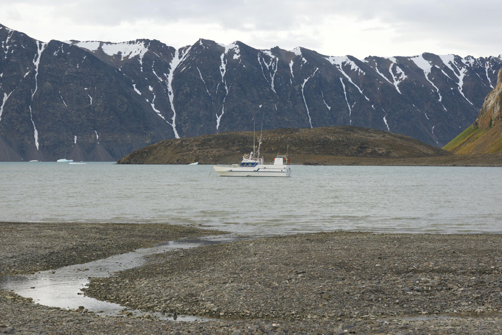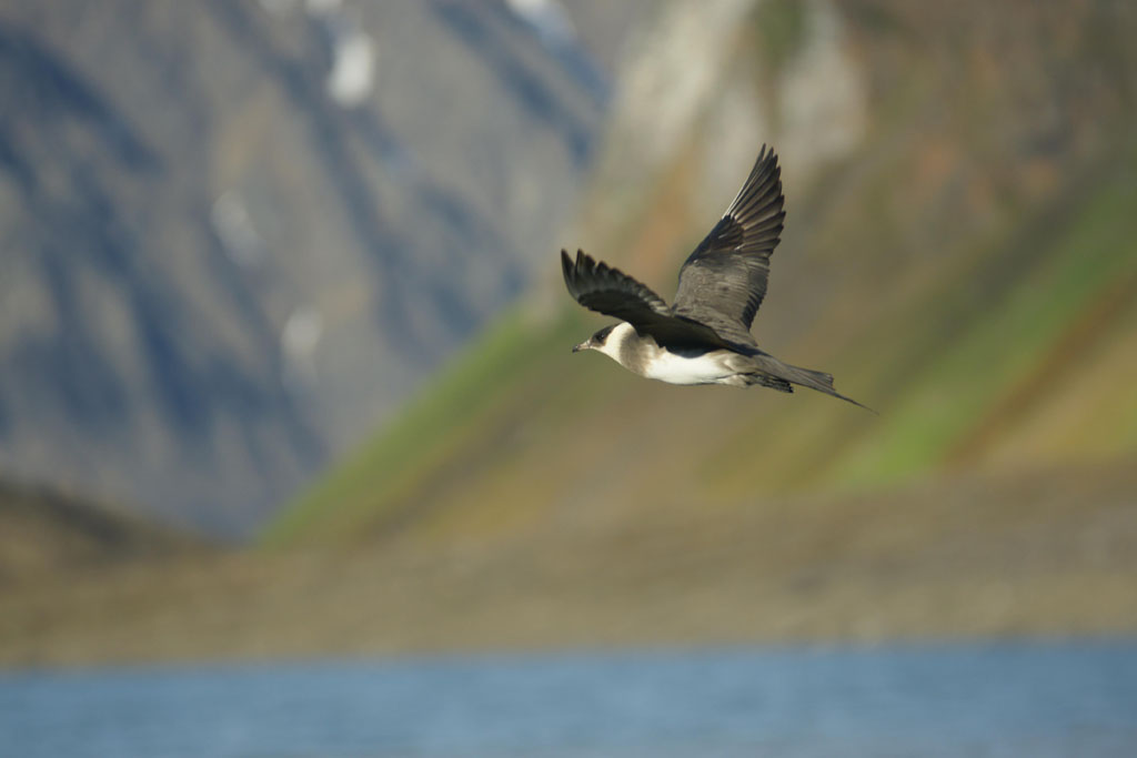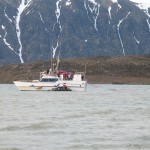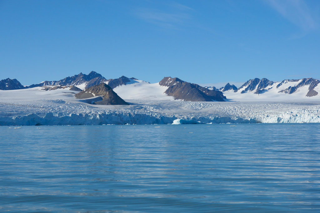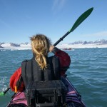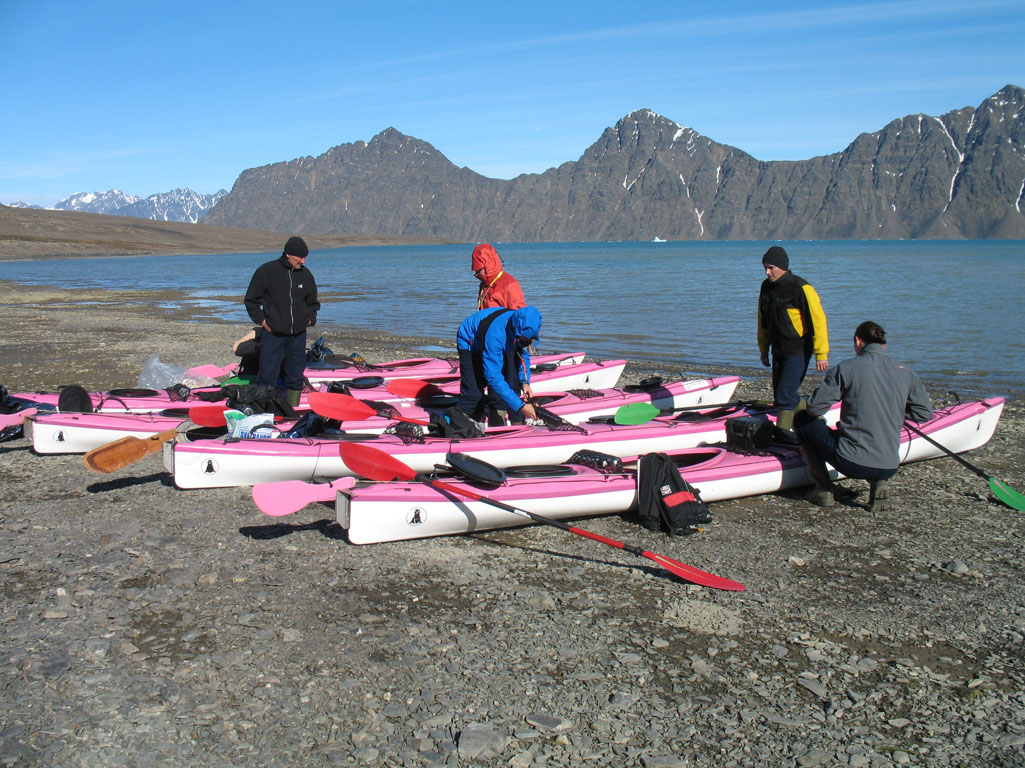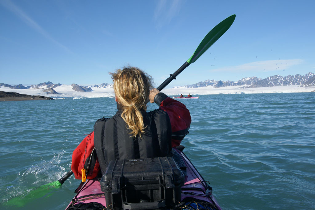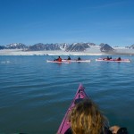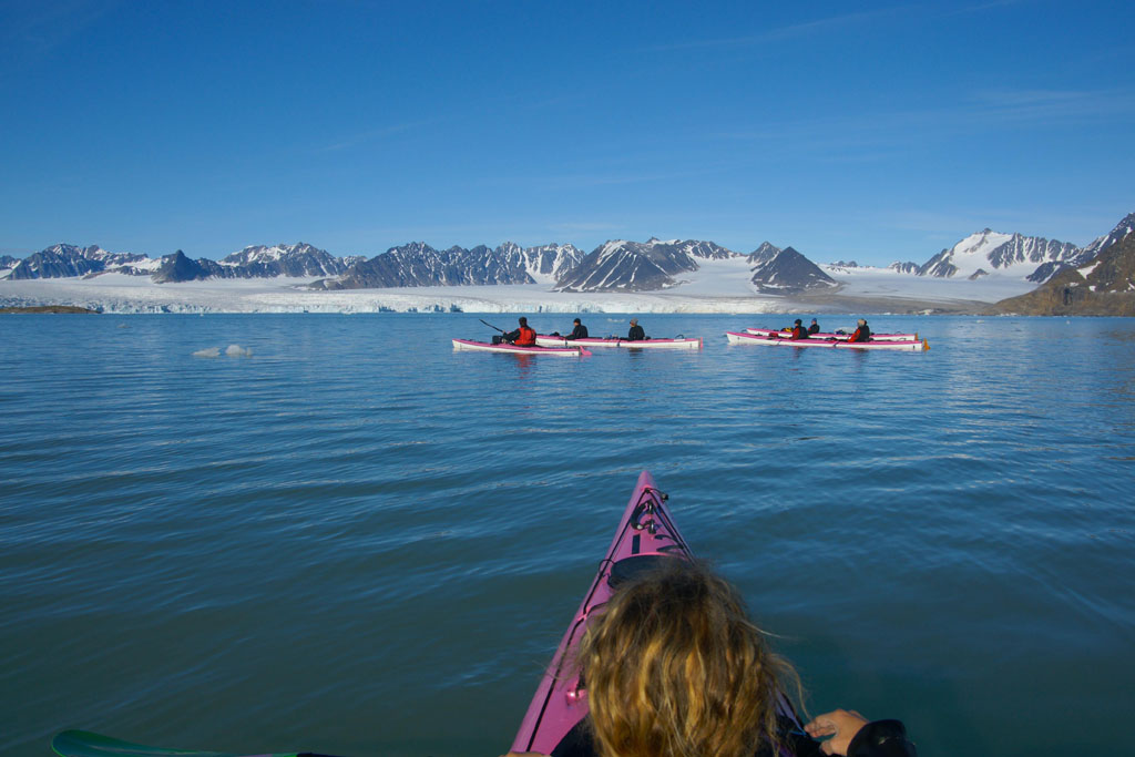 Après quelques minutes de cours théorique, nous enfilons nos tenues de pingouins et embarquons pour la première fois sur nos « bélougas ». C’est parti, avec un superbe soleil en prime ! Les 5 kayaks du groupe avancent par la rive ouest du fjord vers le « Lilliehöökbreen », le glacier qui forme le fond de la baie de la Croix. Nous croisons un petit troupeau de Bernaches nonnettes ainsi que des Eiders à duvet. Le Goéland bourgmestre n’est jamais loin et guette d’éventuels poussins d’Eider à gober.