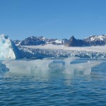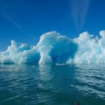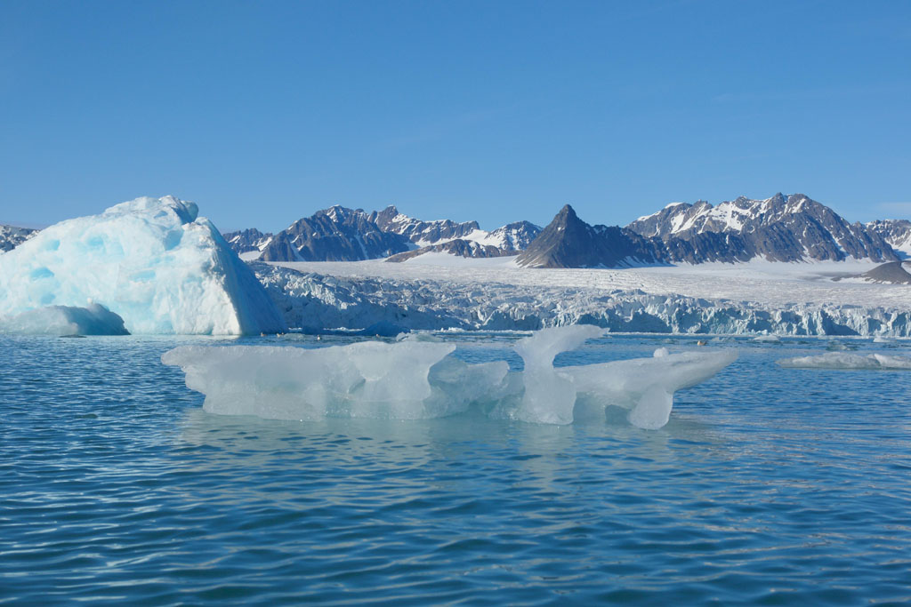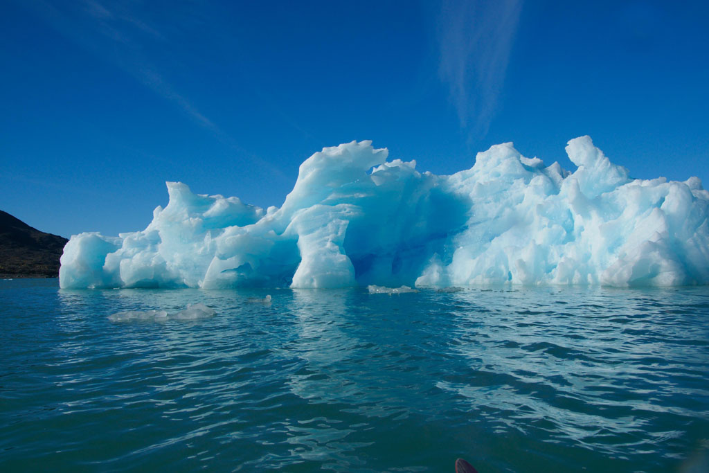Nous naviguons entre des glaçons bleus et blancs de toutes tailles qui crépitent et claquent en fondant tout autour de nous. Le glacier émet parfois un grondement sourd à mesure qu’il avance et nous pouvons voir plusieurs fois des blocs de glace s’écrouler dans l’eau. C’est absolument magnifique !