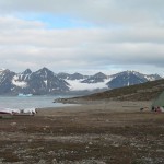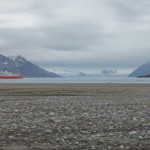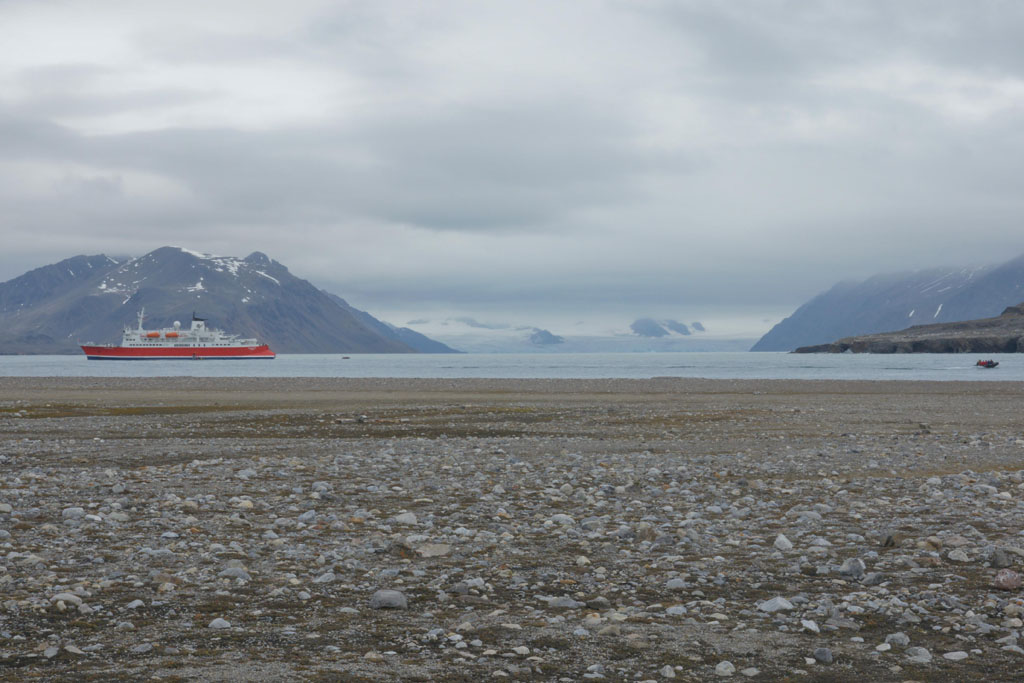 Au réveil, nous découvrons la présence d’un gros bateau de croisière non loin de notre camp. Ce n’est pas vraiment une surprise, puisque ce genre de tourisme est assez répandu au Svalbard et le glacier du 14 juillet est un « spot » intéressant. 5, 6, puis 7 zodiacs sont mis à l’eau et partent vers le glacier… en ralentissant en arrivant à notre hauteur. Je pense que nous avons également fait partie des éléments de l’attraction pour ces personnes, au même titre que le glacier ou la colonie d’oiseaux !