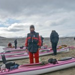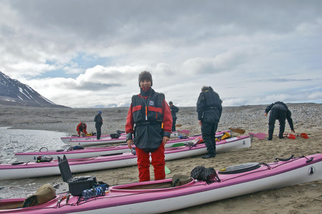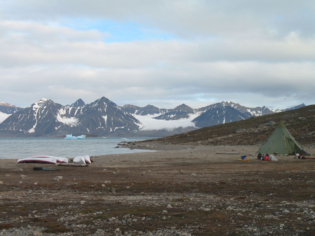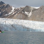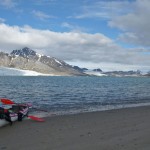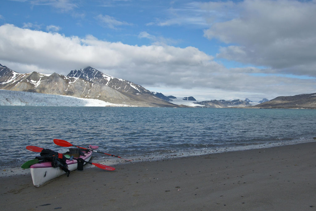 Nous faisons régulièrement des pauses « casse-croûte », avec saucisson et taboulé, sans descendre des kayaks bien sûr ! Le début de l’étape a été éprouvant, mais les glaciers que nous apercevons au fond de la baie et le soleil qui arrive remotivent tout le monde. On scrute la berge à la recherche d’un éventuel « Ursus maritimus » (l’ours polaire), mais rien.