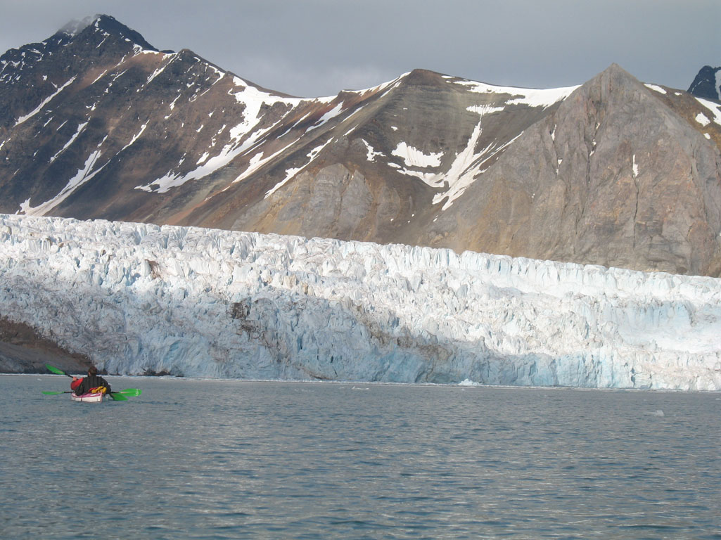 Bref, après avoir démonté le camp, nous repartons avec pour objectif du jour la baie du Roi (Kongsfjorden). Comme hier il fait gris, mais cette fois la mer est plus agitée, avec une houle conséquente et des creux d’1m50 ! Je découvre qu’on peut avoir le mal de mer sur un kayak, et bien sûr mes médicaments sont au fond de mon sac étanche, lui-même au fond du kayak… Heureusement nous avançons bien (même si mes coups de pagaie ne servent pas à grand chose…) et finissons par entrer dans la baie du Roi. La houle devient plus supportable et je peux enfin m’intéresser au paysage, d’autant que le ciel se dégage.
