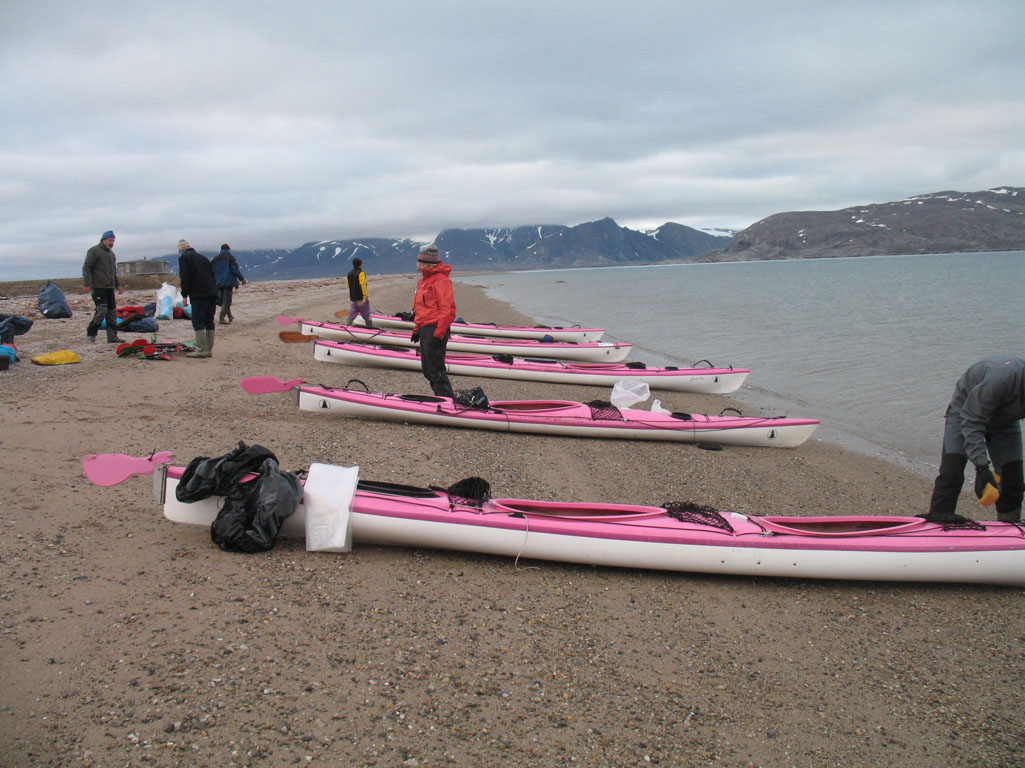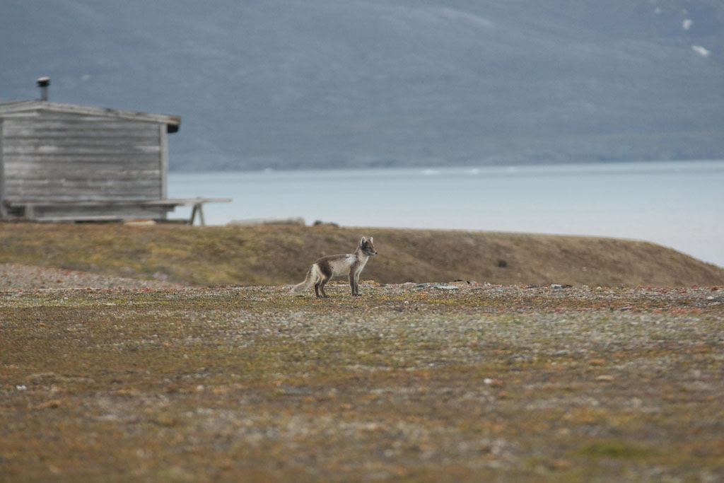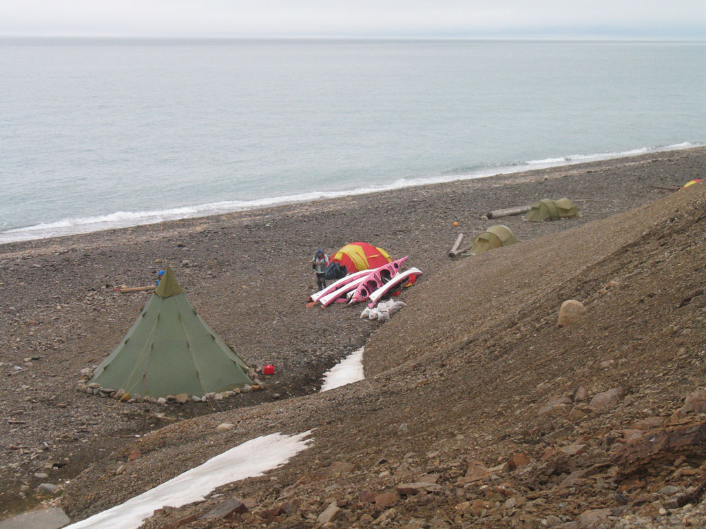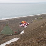 La journée passe lentement : on lit, on discute, on mange, on dort… et on attend. A la mi-journée, tout le groupe part rechercher de l’eau à la rivière située derrière le camp (sécurité oblige vis-à-vis des ours : quand on se déplace, c’est en groupe !). La rivière est bordée de zones humides, où un couple de Labbes parasites nous attend de pied ferme. Leur nid doit être dans les parages, et nous ne sommes pas du tout les bienvenus. Ils nous attaquent, bec en avant. Ce ne sont pas vraiment de petits oiseaux (ils peuvent atteindre 115 cm d’envergure), et leurs coups de bec peuvent être assez désagréables ! L’un deux finit par s’attaquer à Pierre… et repart avec son bonnet péruvien dans le bec ! Et bien sûr, pour une fois personne n’a d’appareil photo sous la main pour immortaliser le vol … Heureusement il le lâche avant d’atteindre la mer et on peut le récupérer.