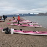 Nous revenons au camp et, le vent étant tombé, nous commençons le démontage du camp vers 20h. Il est 21h45 lorsque nous montons dans nos kayaks, très contents d’enfin pouvoir reprendre la mer après 48h de pause. Tout est calme, nous avançons à bonne vitesse et atteignons le cap marquant la sortie de la baie du Roi sous une magnifique lumière vers minuit.