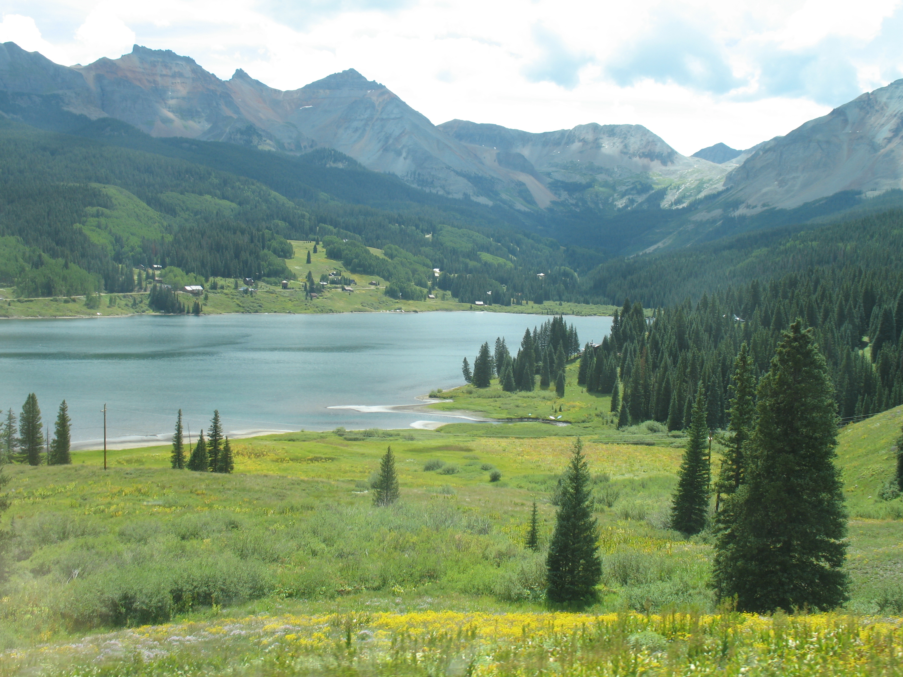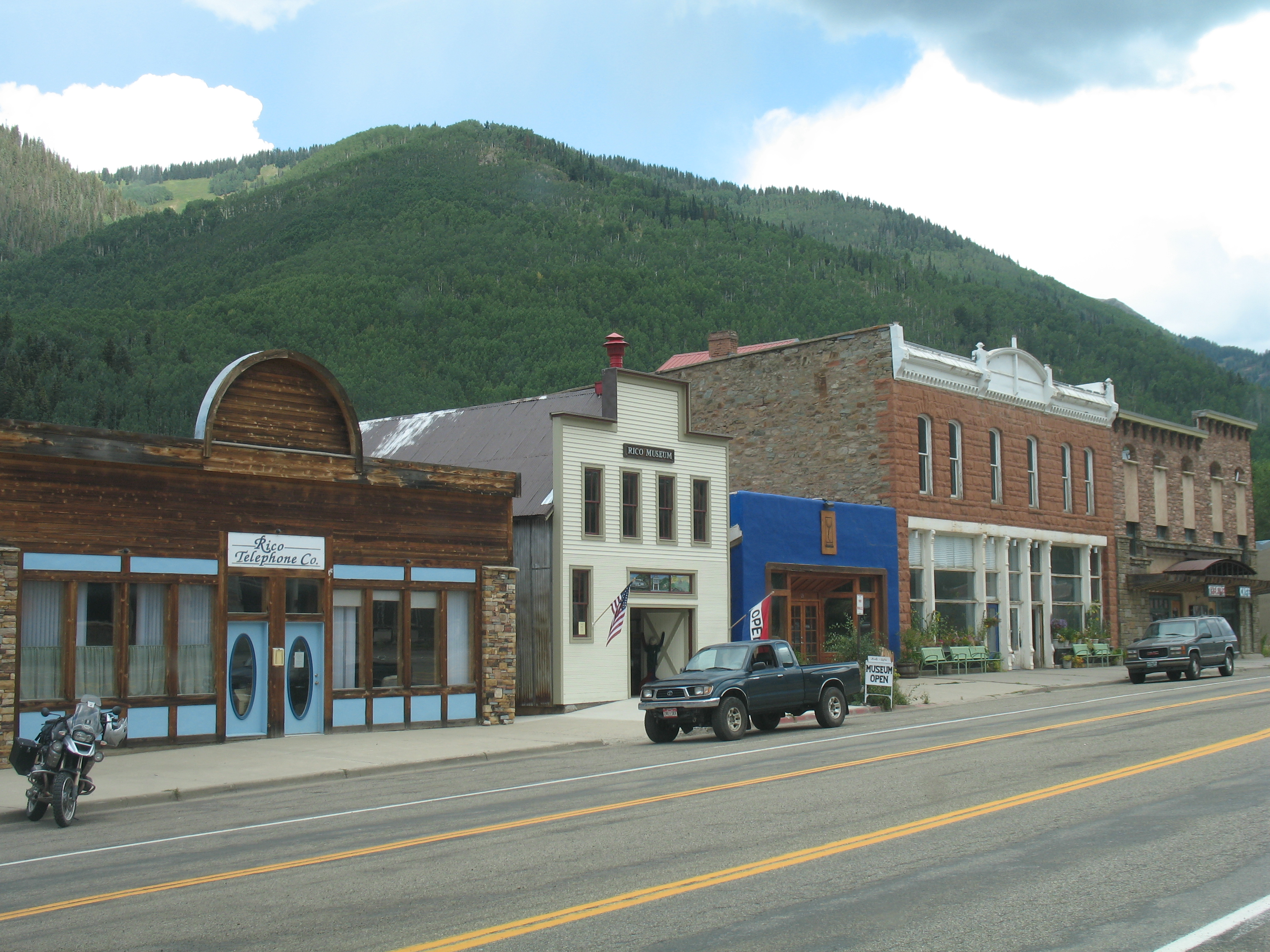 Sur les conseils de mes correspondants américains sur le forum RV Park Reviews, nous avons emprunté la route 160 vers Dolores pour remonter la 145 vers Ridgway par Telluride. C’est la route de la vallée, contrairement à la route 550 qui est la route de crête par Silverton. Cette route de la vallée est de toute beauté et sans aucun problème pour le camping-car. Elle serpente agréablement à travers la forêt et les montagnes le long de la Dolores River. On peut y voir des fermes, des ranchs, un lac inattendu (Trout Lake), des roches rouges comme en Utah… et surtout un petit village plein de charme et sa postière sympa : Rico.