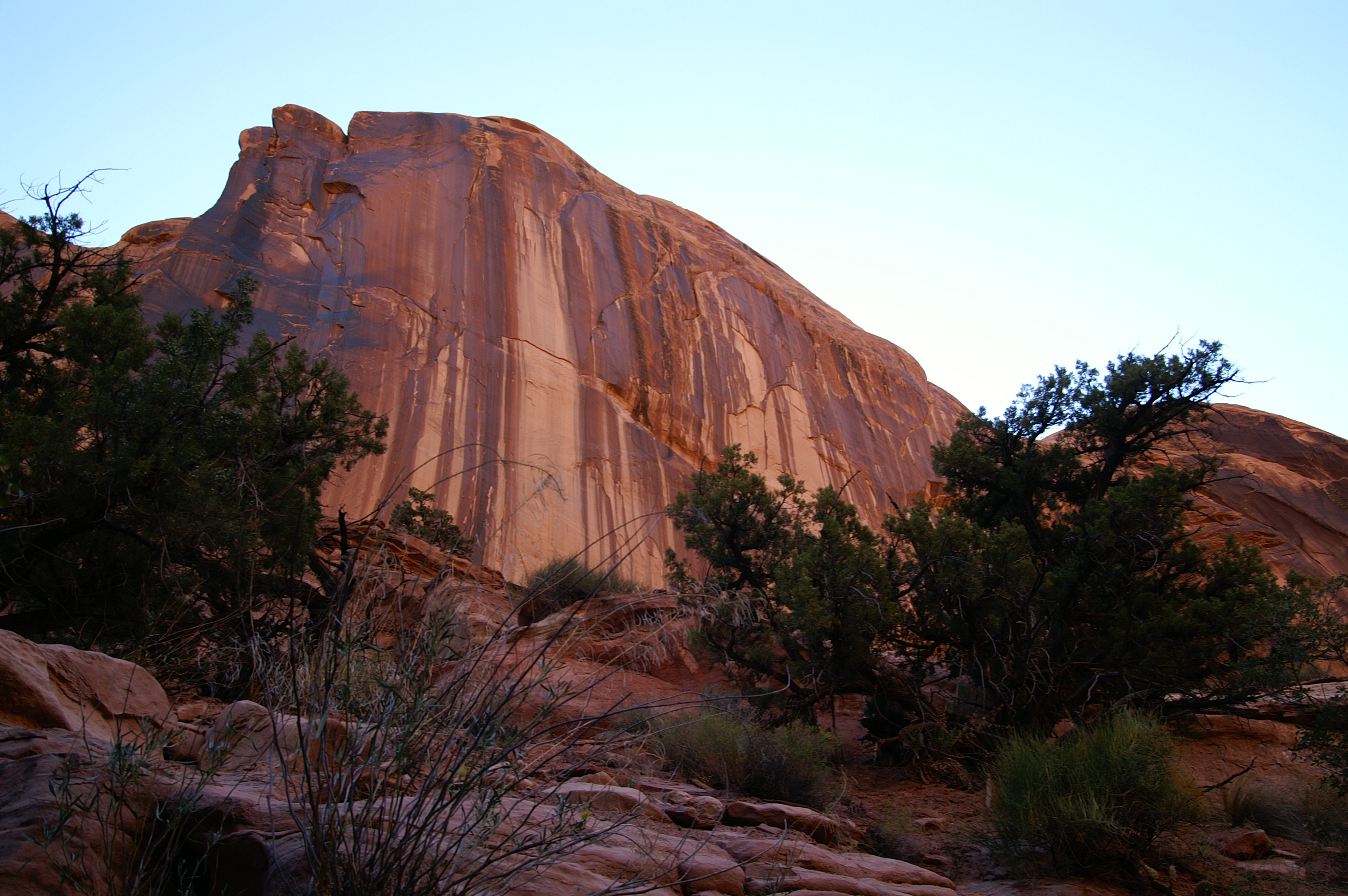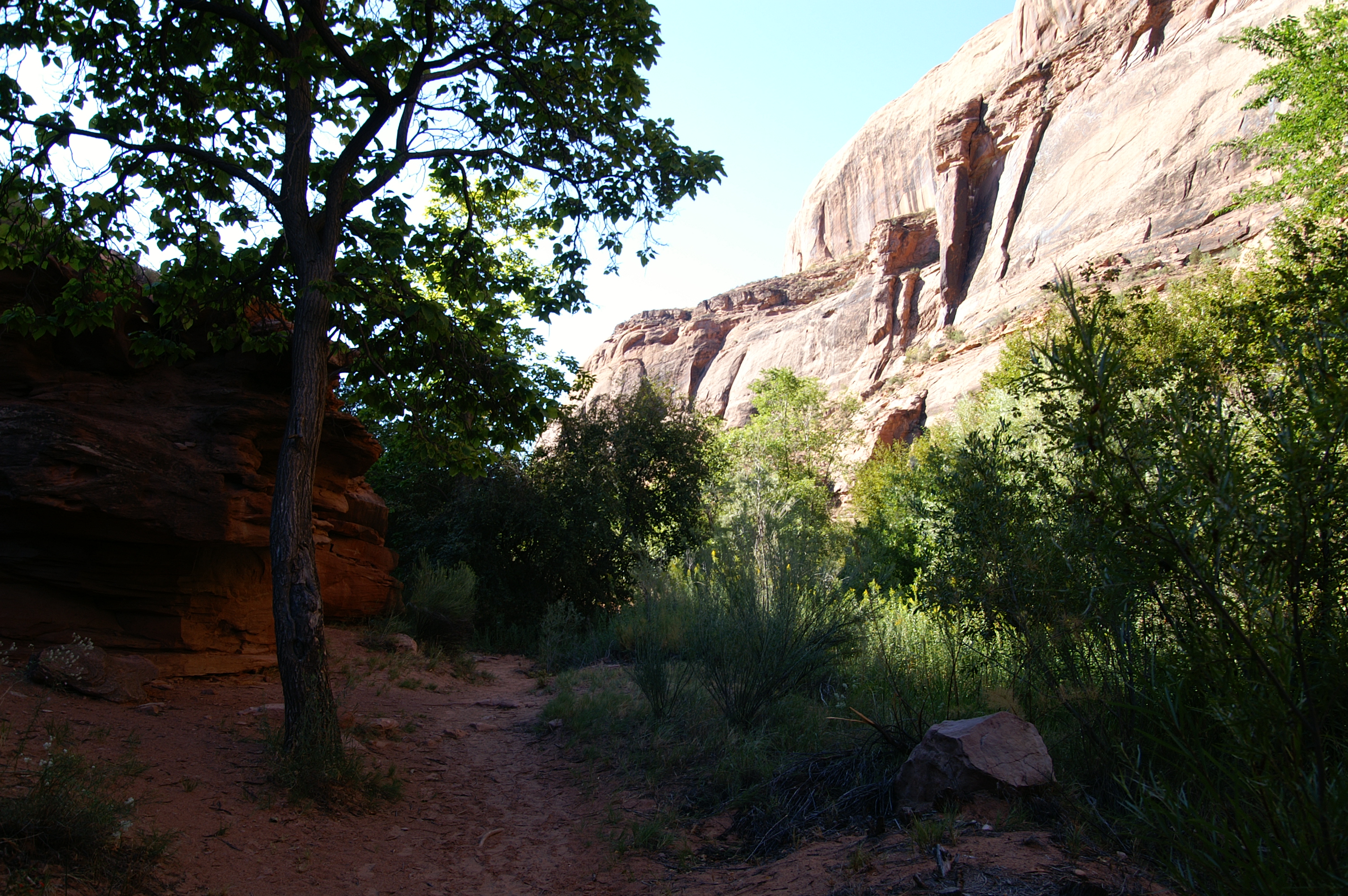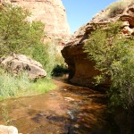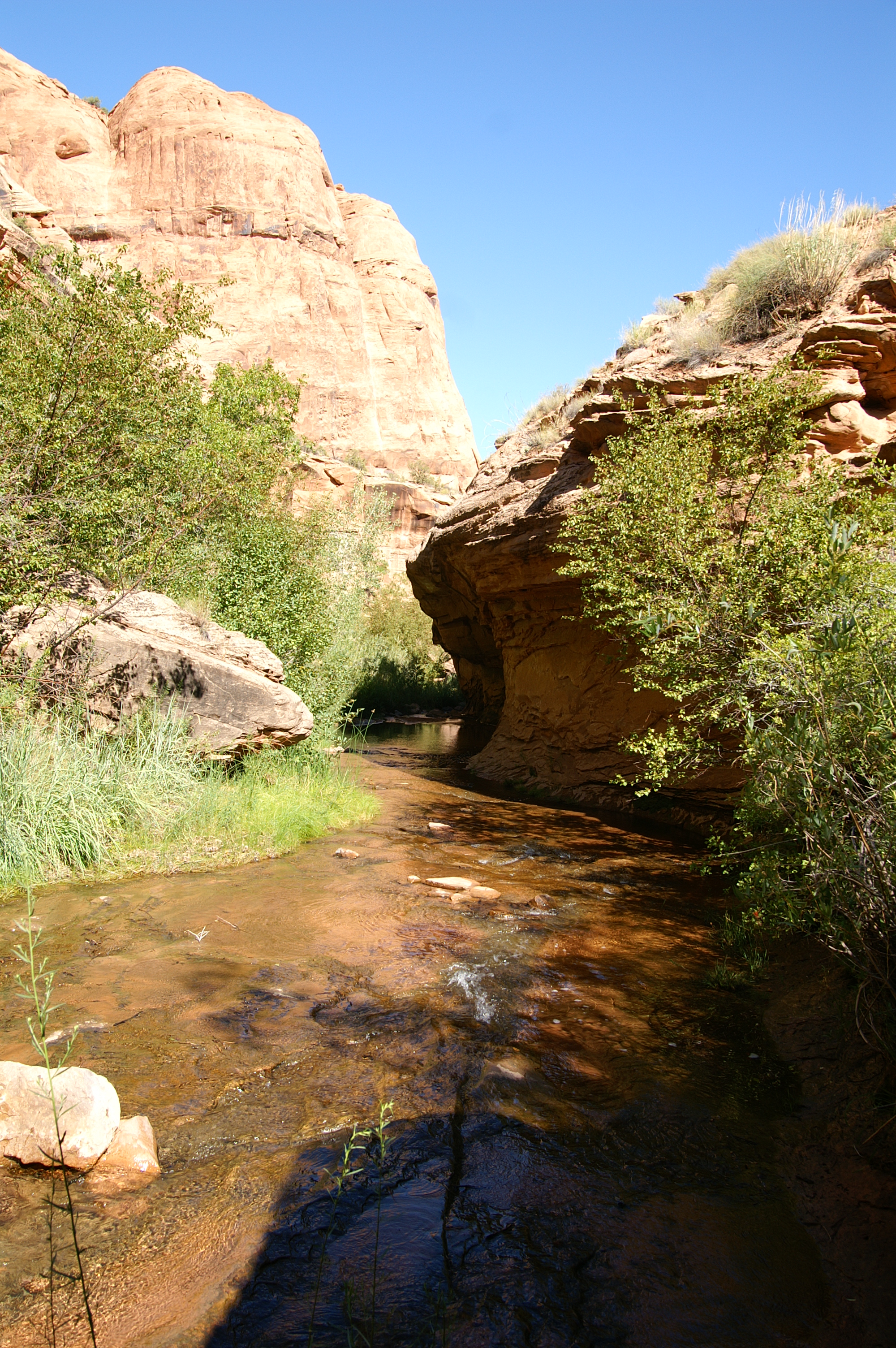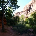 Negro Bill Canyon, dont nous n’avons fait que les trois quarts (environ 5 km aller-retour), comporte plusieurs franchissements du cours d’eau qui longe le trail et quelques passages délicats pour qui n’a pas le pied marin. C’est une randonnée au cœur du canyon avec une vue en contre-plongée sur les falaises qui le surplombent. Il est préférable de l’entreprendre le matin de bonne heure pour bénéficier de l’ombre et des températures plus supportables que dans l’après-midi (36°C ce jour là à Moab).