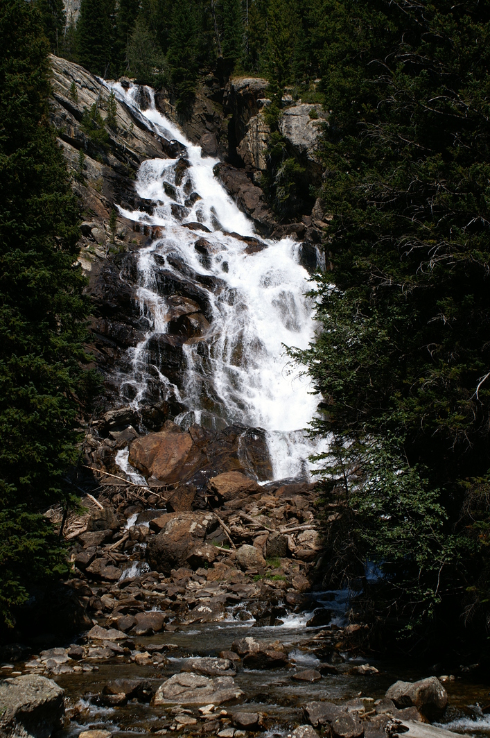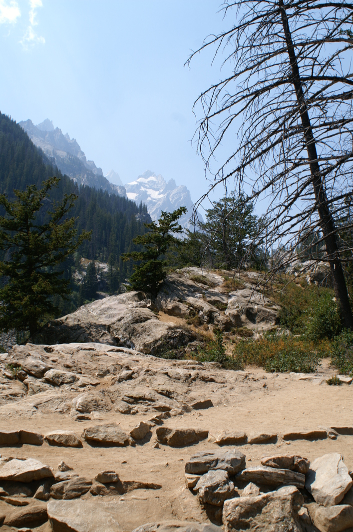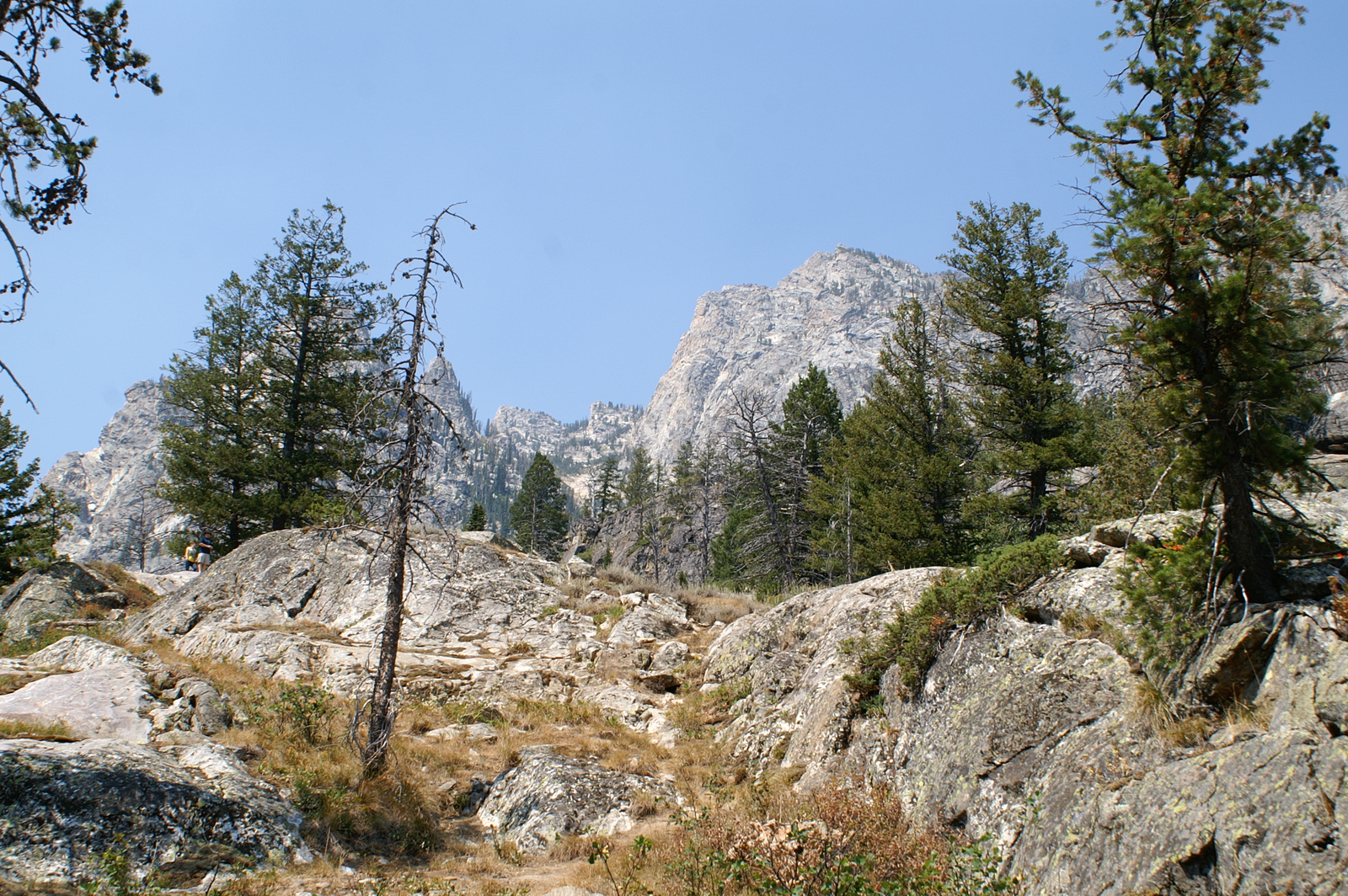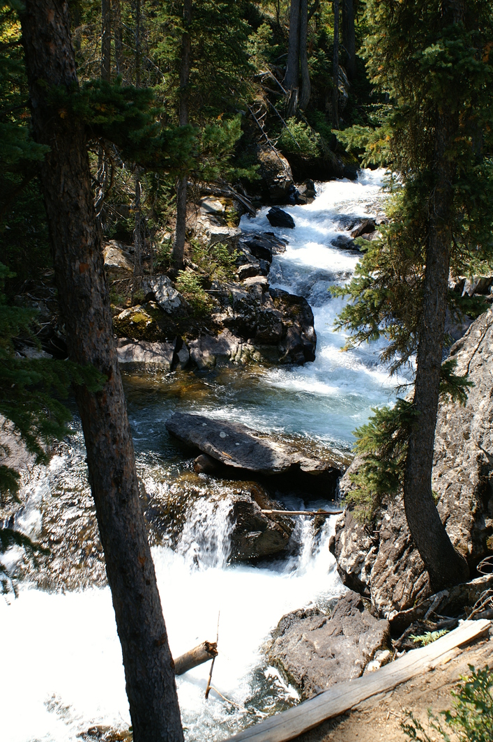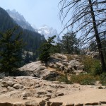 La traversée de Jenny Lake et les balades associées supposent que l’on puisse d’abord trouver une place sur l’un des deux parkings… et en camping car cela ne facilite pas les choses, tant le parking est saturé dès 11h. A force de persévérance et de patience, nous finissons quand même par caser nos 7,60 m et à prendre le shuttle boat, qui offre de très beaux points de vue sur le lac et les montagnes. L’ascension vers les Hidden Falls suit en partie le cours d’une rivière jusqu’au pied de la cascade. La suite du trail mène à Inspiration Point, dont un arrêt intermédiaire permet déjà de contempler toute l’étendue du lac.