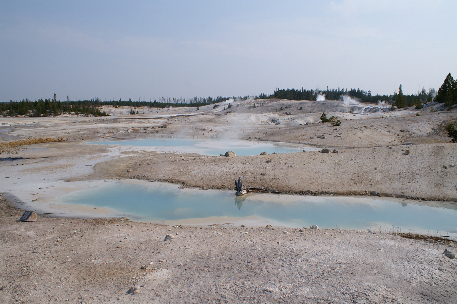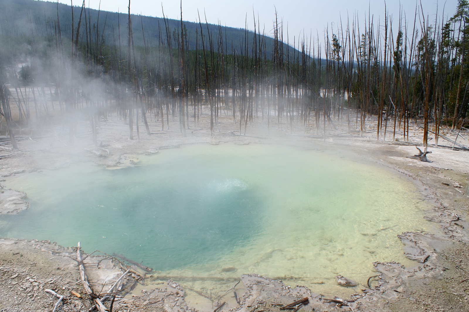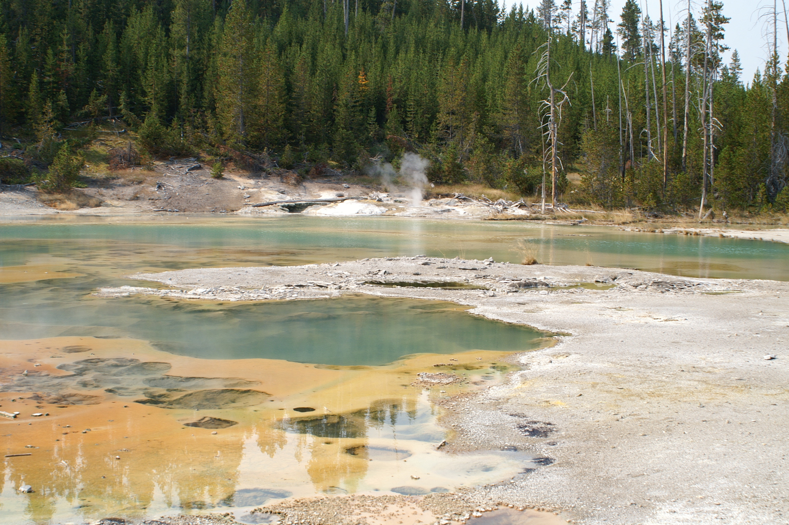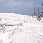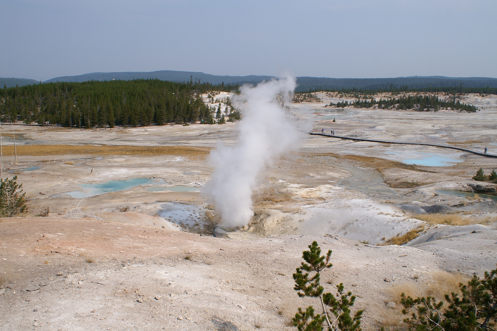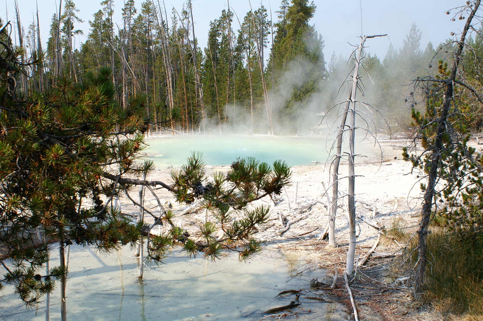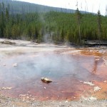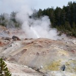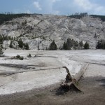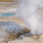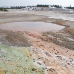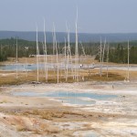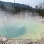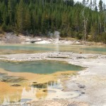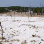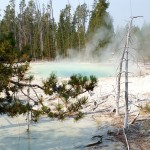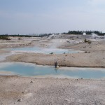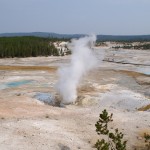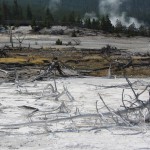 Quelques miles plus loin, nous attaquons la visite du matin : Norris Geyser Basin, composé de 2 parties assez différentes. Porcelaine Basin est une petite plaine où toutes les mares et fumeroles (plutôt odorantes) s’offrent au regard depuis le promontoire de départ. Un chemin ombragé fait ensuite la liaison avec Back Basin, où nous retrouverons les phénomènes d’hydrothermalisme habituels accompagnés de bouillonnements, crépitements et vapeurs de souffre étouffantes. Dans une juxtaposition de couleurs improbable, les arbres pétrifiés sur des champs d’une blancheur éblouissante succèdent à la noirceur des troncs calcinés et au vert des pins renaissants…