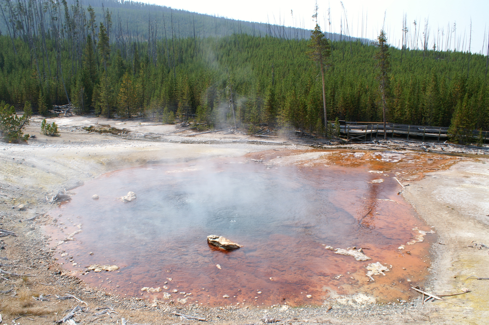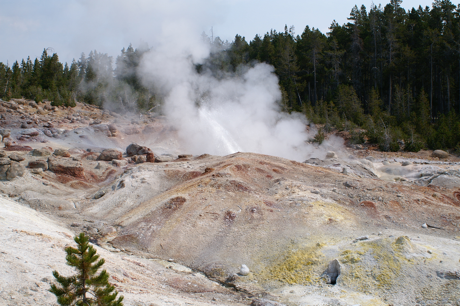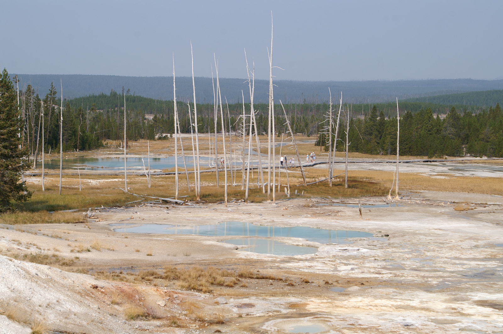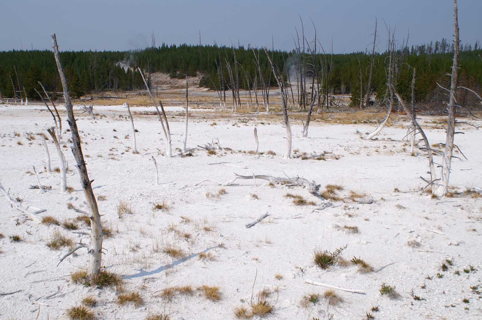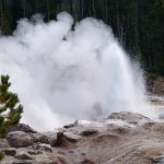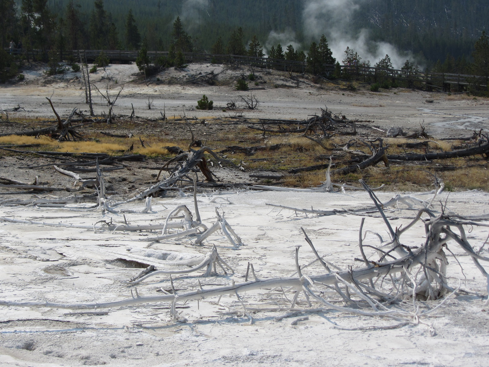 Quelques miles plus loin, nous attaquons la visite du matin : Norris Geyser Basin, composé de 2 parties assez différentes. Porcelaine Basin est une petite plaine où toutes les mares et fumeroles (plutôt odorantes) s’offrent au regard depuis le promontoire de départ. Un chemin ombragé fait ensuite la liaison avec Back Basin, où nous retrouverons les phénomènes d’hydrothermalisme habituels accompagnés de bouillonnements, crépitements et vapeurs de souffre étouffantes. Dans une juxtaposition de couleurs improbable, les arbres pétrifiés sur des champs d’une blancheur éblouissante succèdent à la noirceur des troncs calcinés et au vert des pins renaissants…
