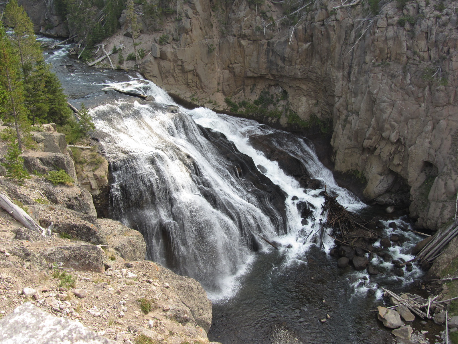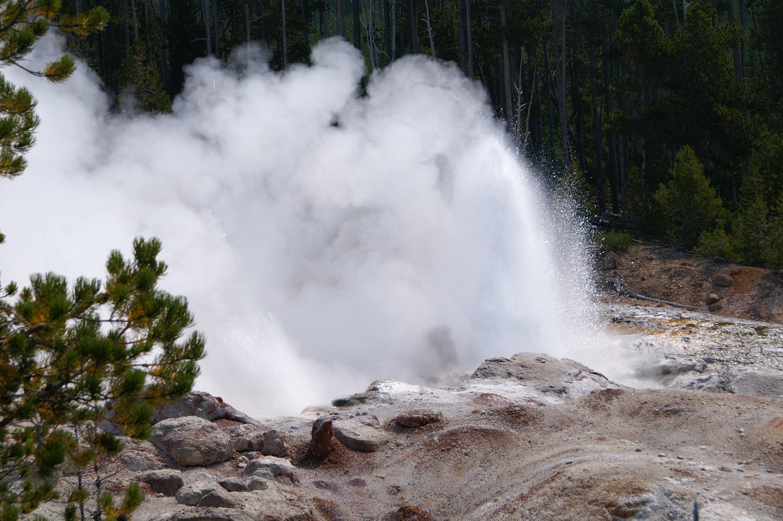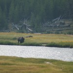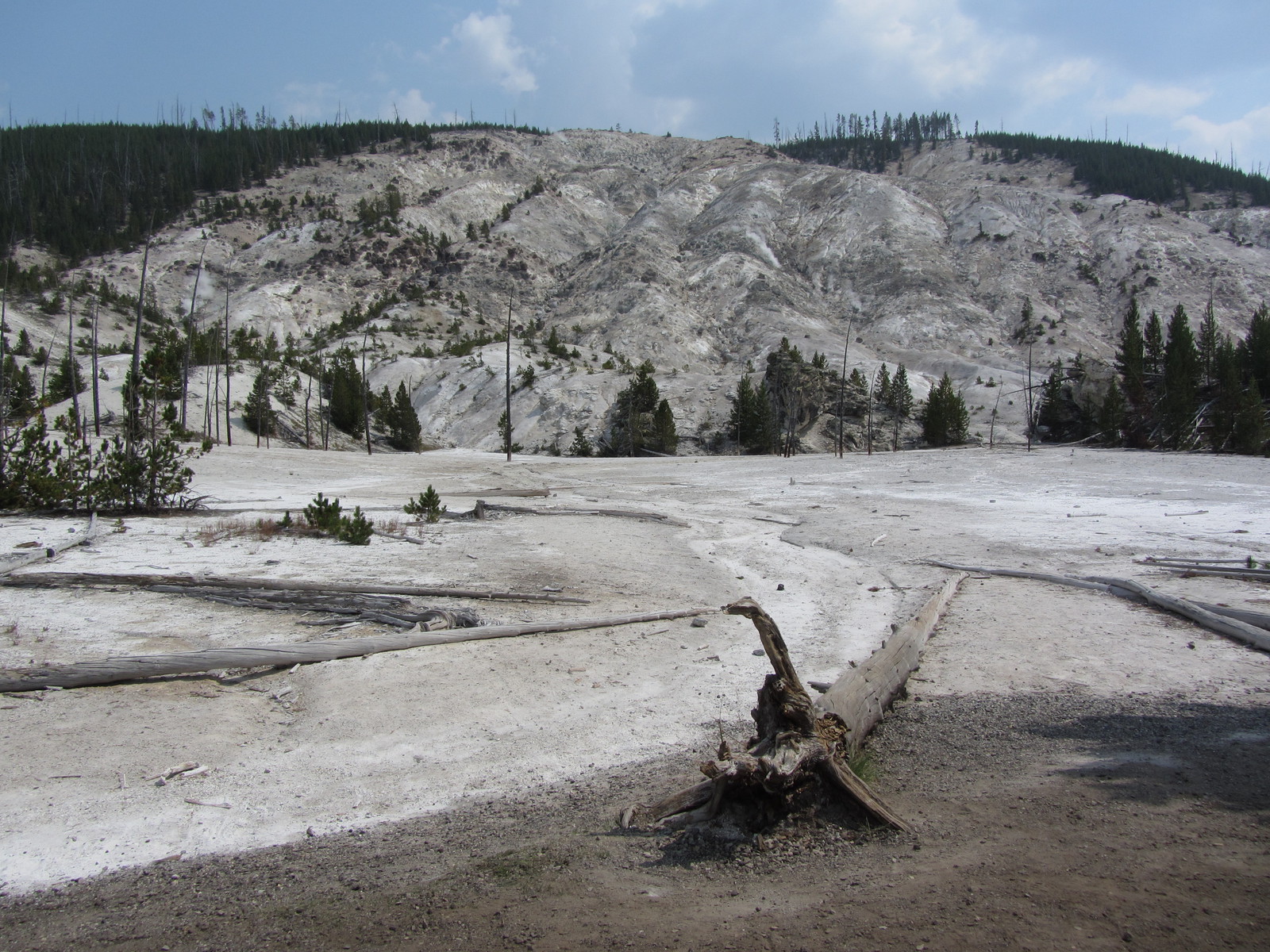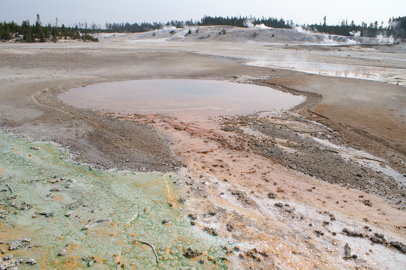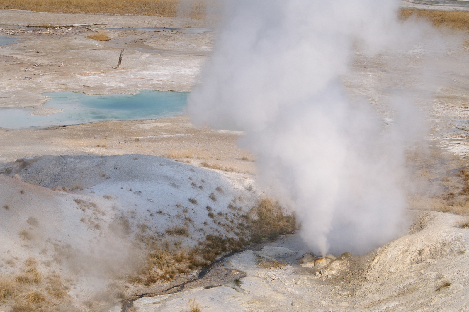 Quelques miles plus loin, nous attaquons la visite du matin : Norris Geyser Basin, composé de 2 parties assez différentes. Porcelaine Basin est une petite plaine où toutes les mares et fumeroles (plutôt odorantes) s’offrent au regard depuis le promontoire de départ. Un chemin ombragé fait ensuite la liaison avec Back Basin, où nous retrouverons les phénomènes d’hydrothermalisme habituels accompagnés de bouillonnements, crépitements et vapeurs de souffre étouffantes. Dans une juxtaposition de couleurs improbable, les arbres pétrifiés sur des champs d’une blancheur éblouissante succèdent à la noirceur des troncs calcinés et au vert des pins renaissants…