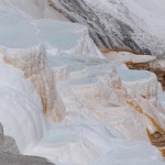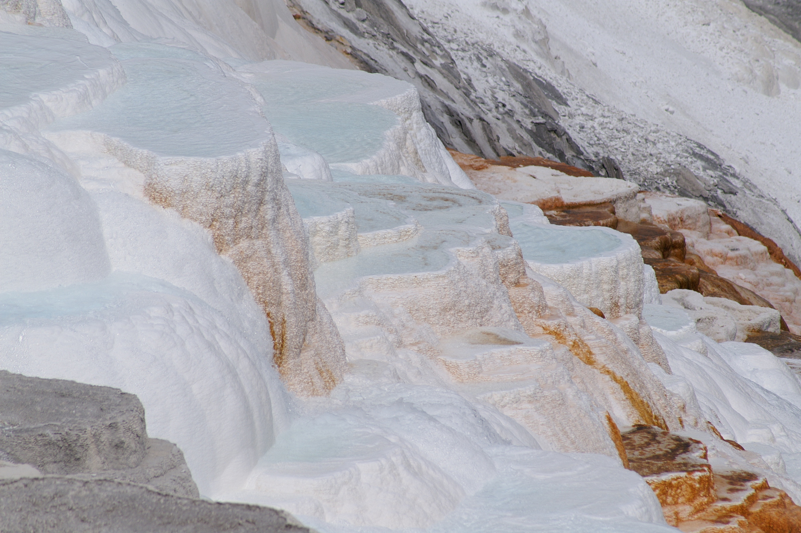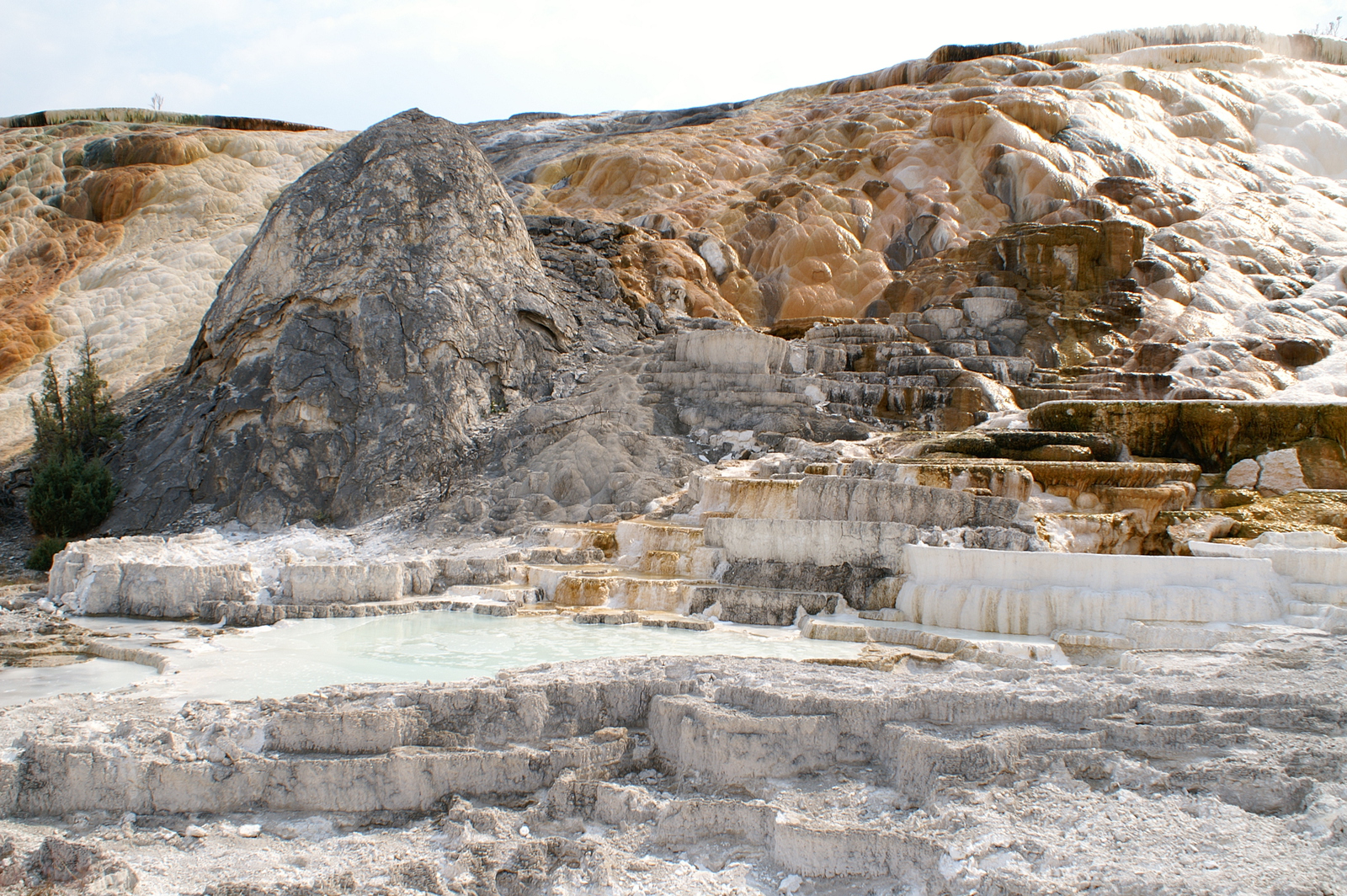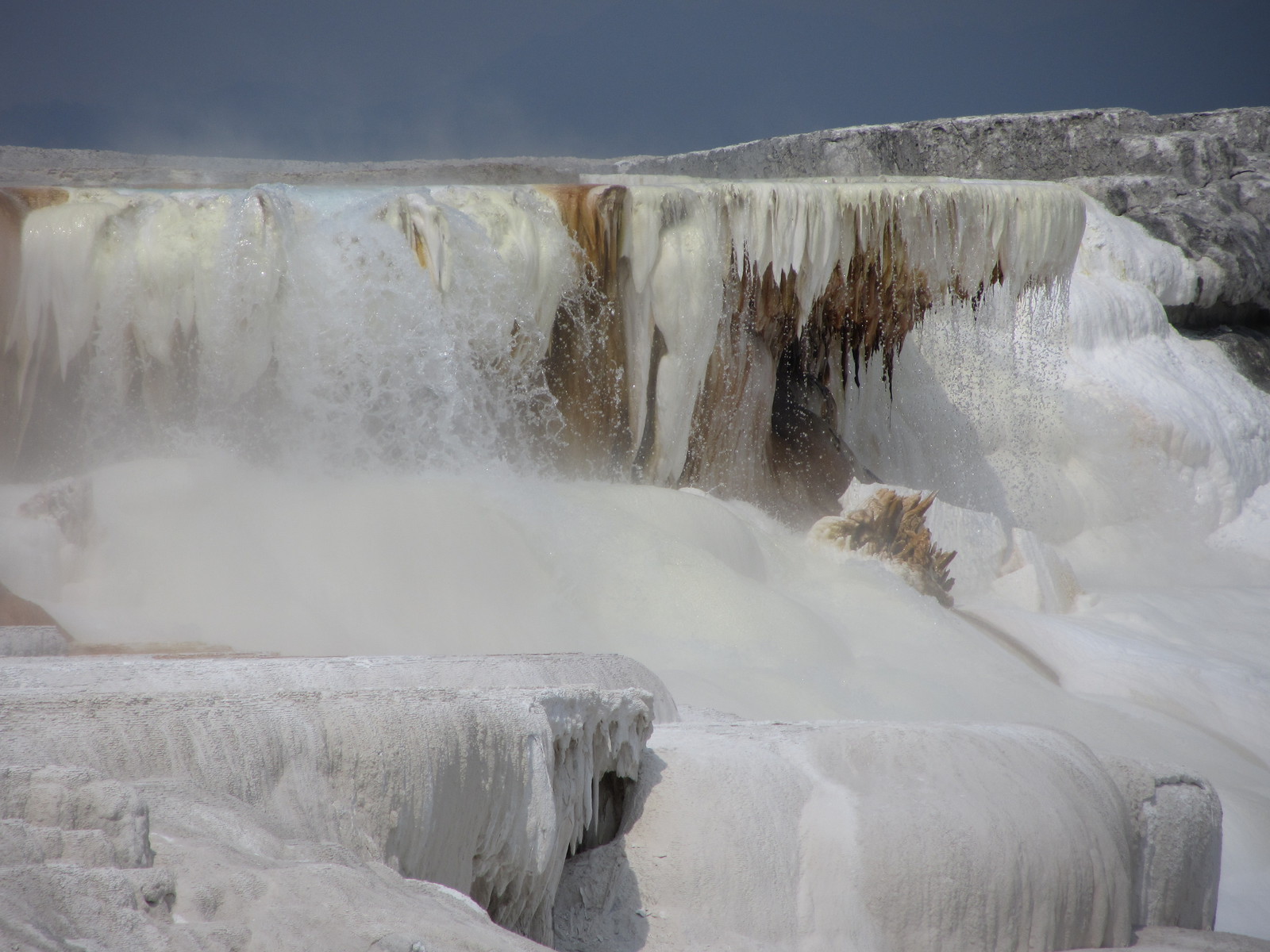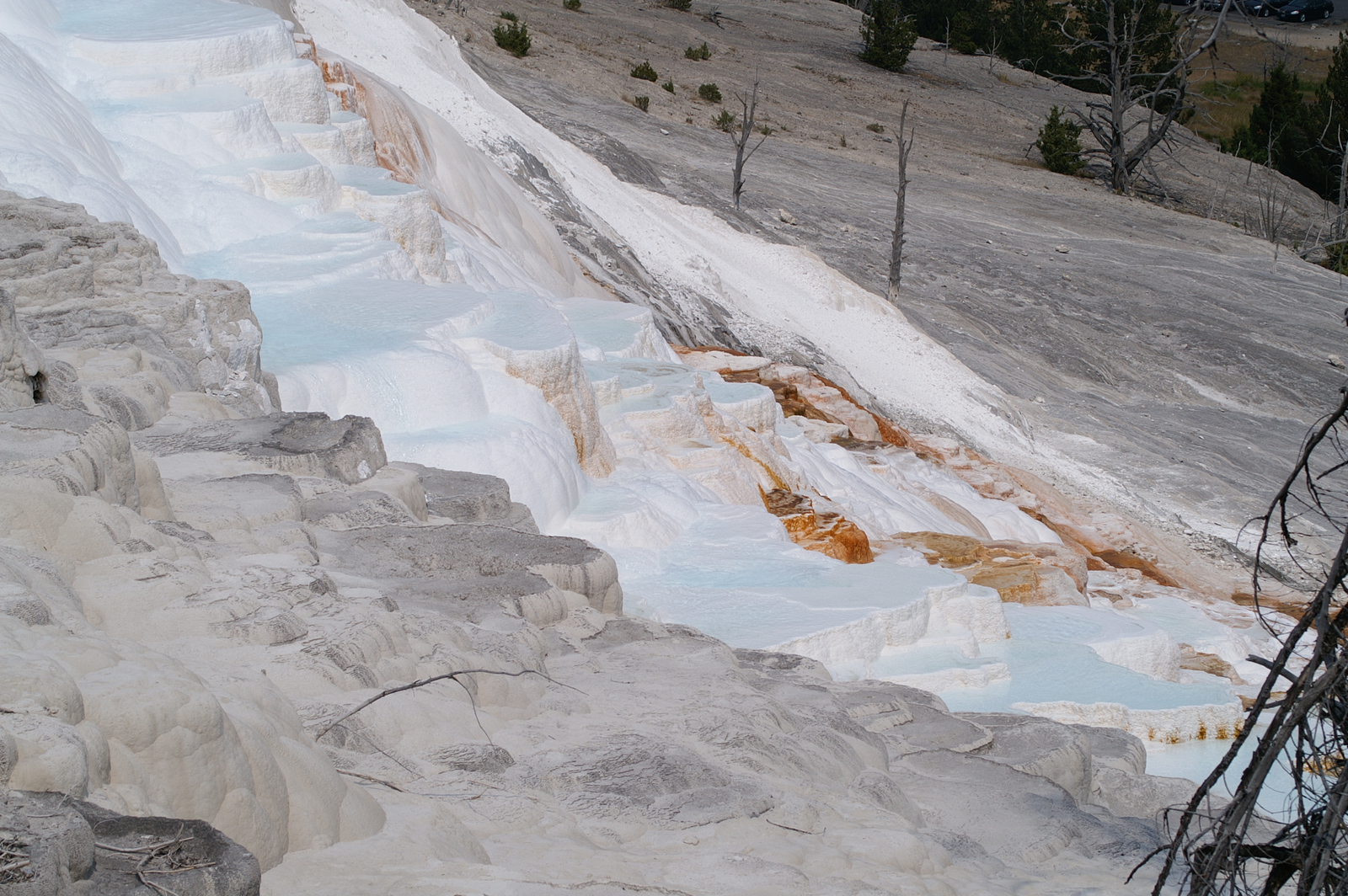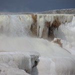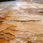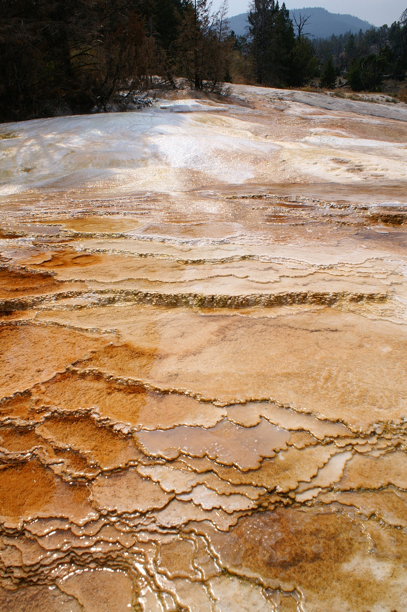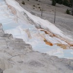Un peu plus vers le nord, nous atteignons enfin Mammoth Hot Springs, renommé pour ses différentes « terrasses » multicolores. Un premier arrêt près de Upper Terrace nous amène au site de Canary Spring, où l’eau s’écoule et déborde de marche en marche pour y former des vasques orange, blanches et bleutées. A peu de distance, le point d’orgue de Lower Terrace, Palette Spring, décuple le phénomène et surprend à la fois par la variété de ses formes et de ses couleurs : les rochers arrondis précèdent des escaliers abrupts dans un éventail d’orange, gris, blanc et bleu pastel. A cette heure de l’après-midi toutefois, l’éclairage n’est pas optimal et nous nous promettons de revenir le lendemain matin.