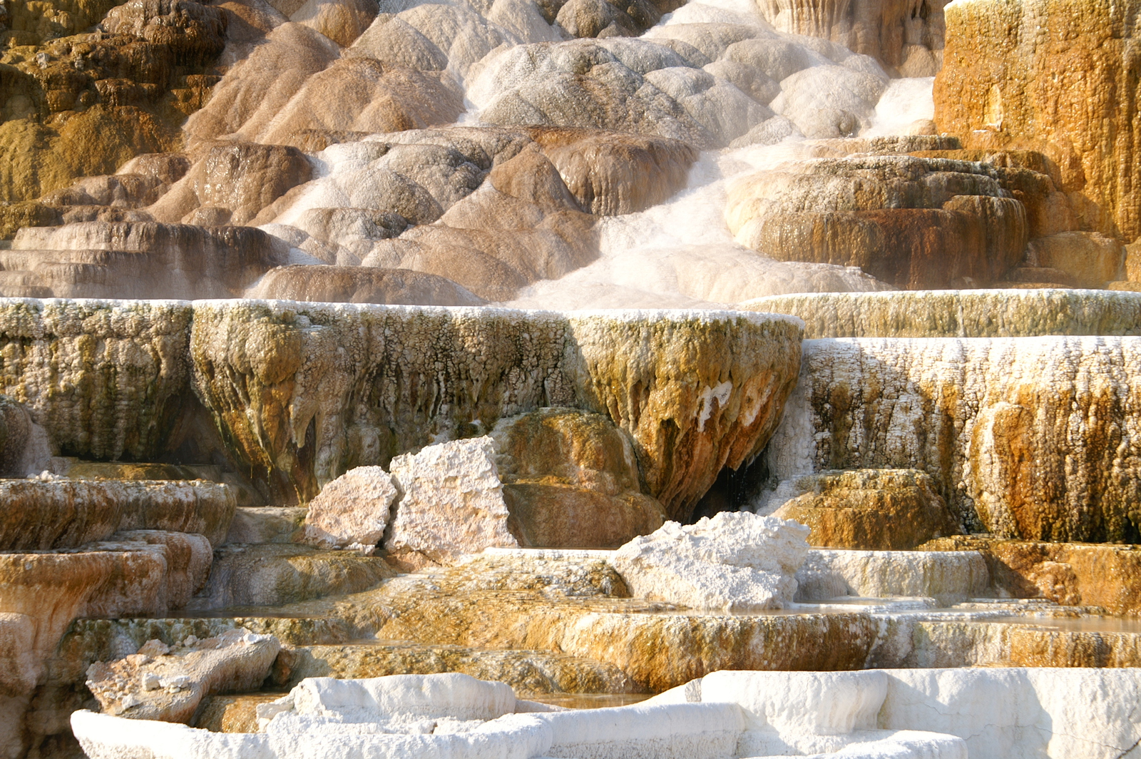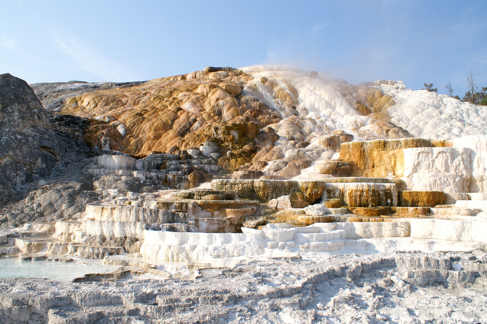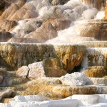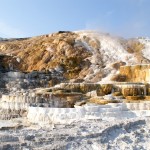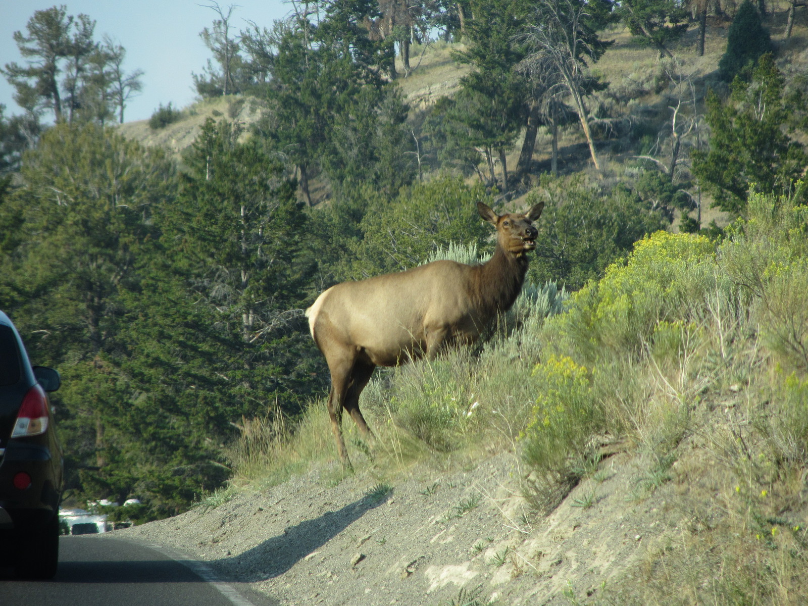 Avant d’attaquer le programme prévu pour cette journée, nous refaisons un petit détour par Mammoth pour profiter de la lumière du matin sur Palette Spring, dont les terrasses multicolores ressortent bien mieux que la veille. Au bord de la route, nous retrouvons avec stupéfaction les elks du centre ville qui prennent leur petit déjeuner à quelques mètres des voitures.