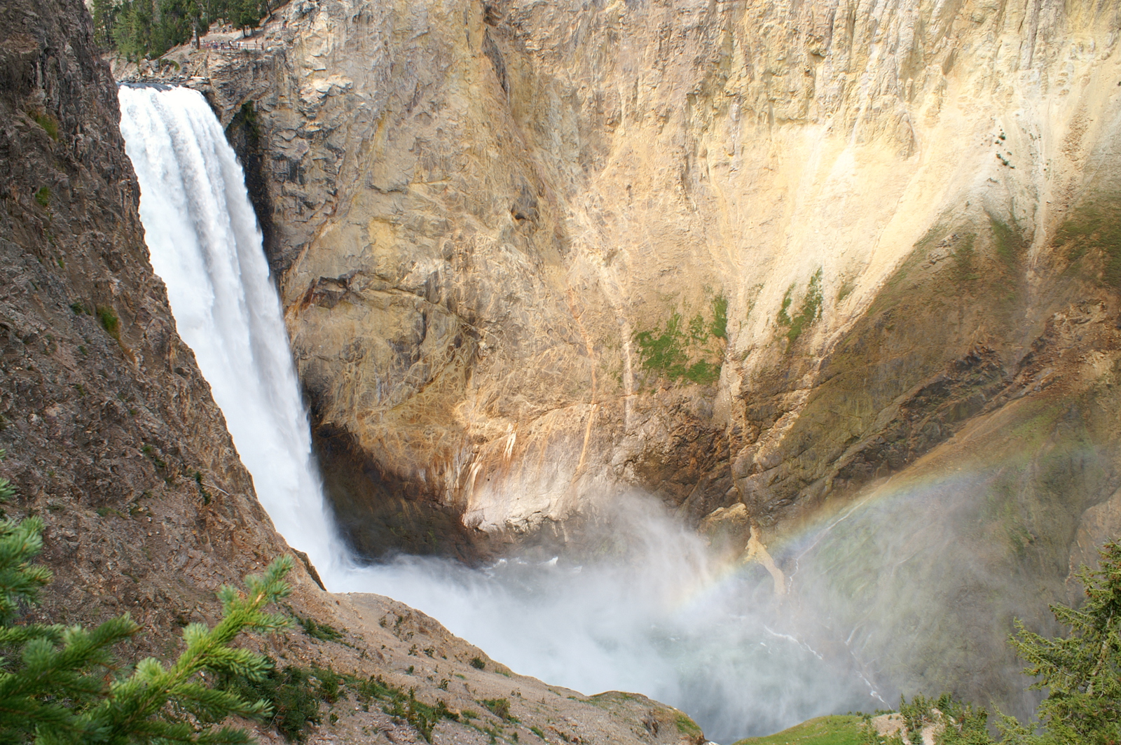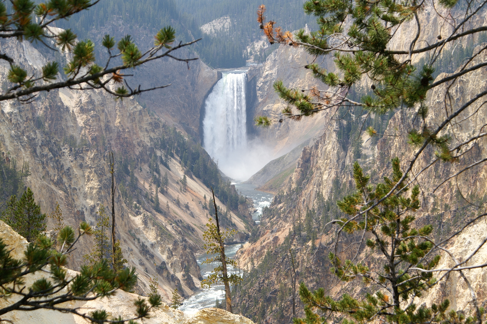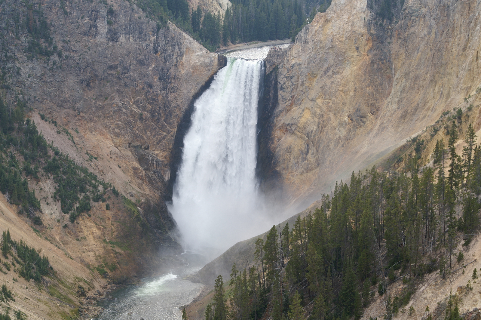 Après quelques égarements causés par des travaux importants entre Tower Junction et Canyon, nous finissons par atteindre Canyon Village pour prendre possession de notre emplacement au campground – une fois de plus situé dans une forêt de pins. L’après-midi sera consacrée à arpenter en tous sens les deux rives du Grand Canyon de Yellowstone. Nous commençons par en mesurer l’étendue, la profondeur (305 m) et la palette de couleurs (à dominante jaune) depuis Artist Point, situé à l’extrémité de la rive sud. Nous enchainons avec les 328 marches de Uncle Tom’s Trail qui nous emmènent en bas des Lower Falls ; superbe ballade, mais gare au vertige en regardant le sol défiler sous les marches métalliques des escaliers… et ne pas oublier de garder des forces pour la remontée !