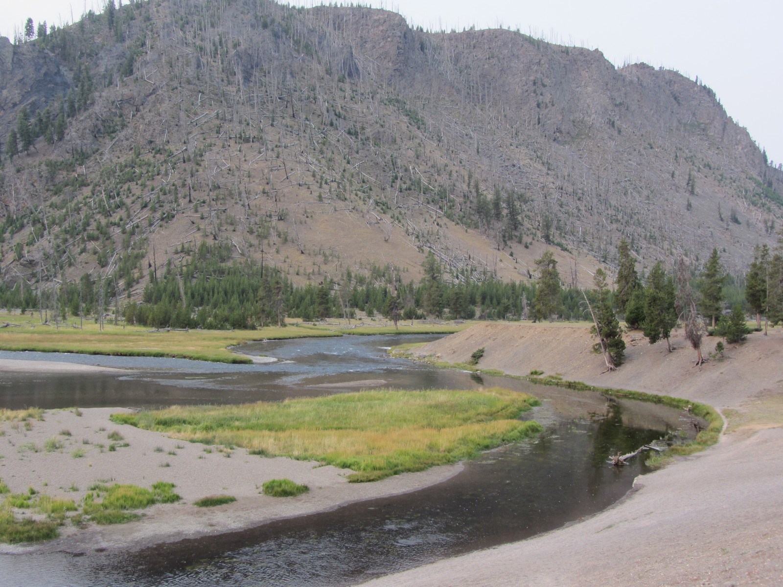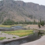 - Vue sur les méandres de la Madison River à 100 mètres à peine. Juste en bas à gauche de la photo il y a une source chaude qui permet de se baigner dans la rivière.