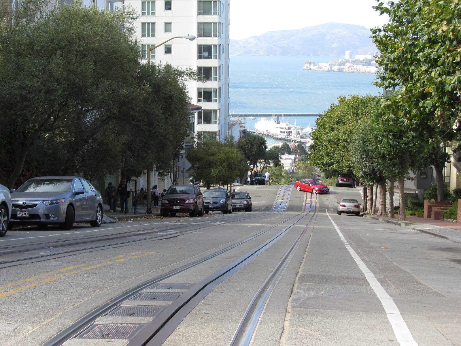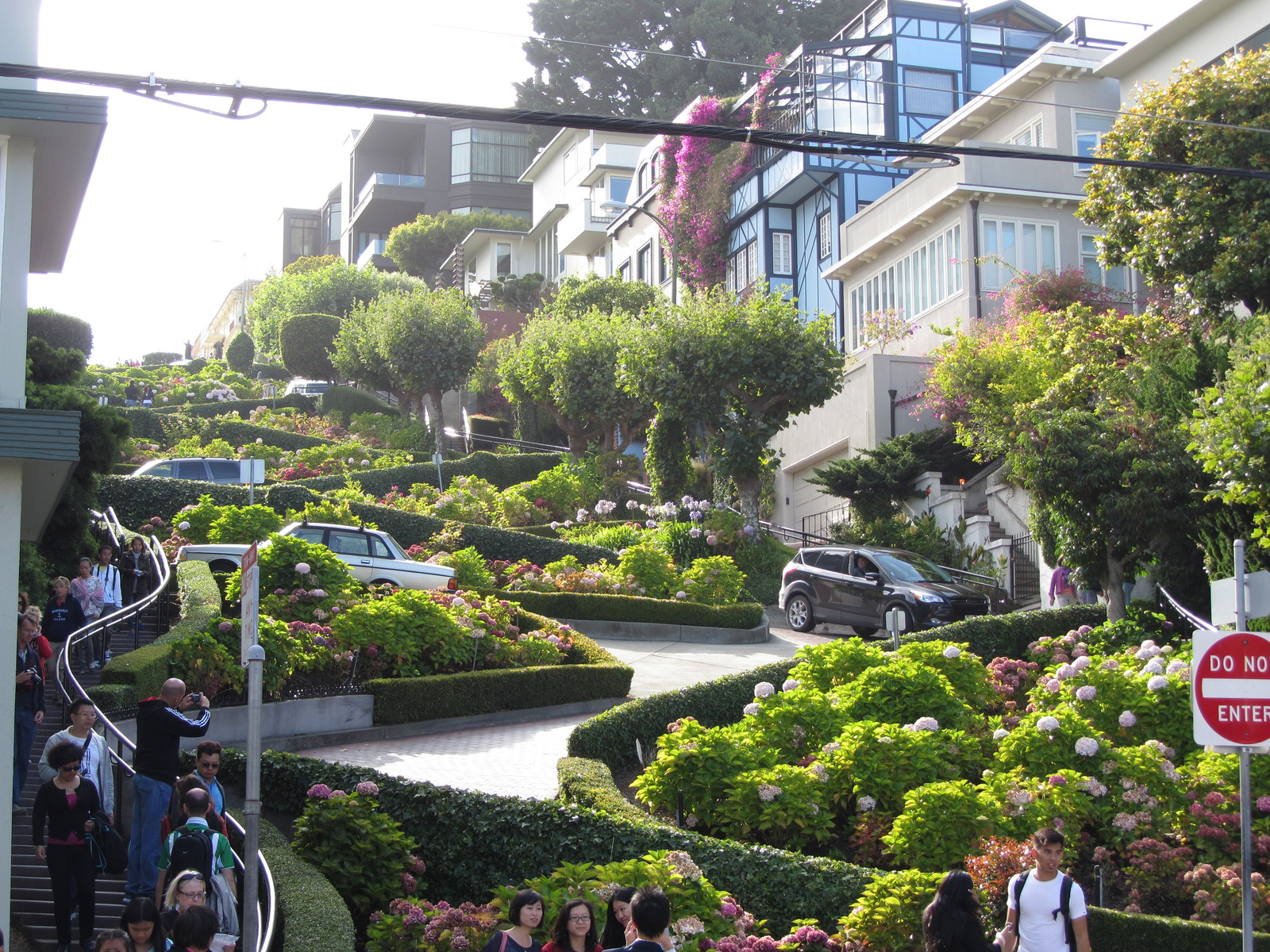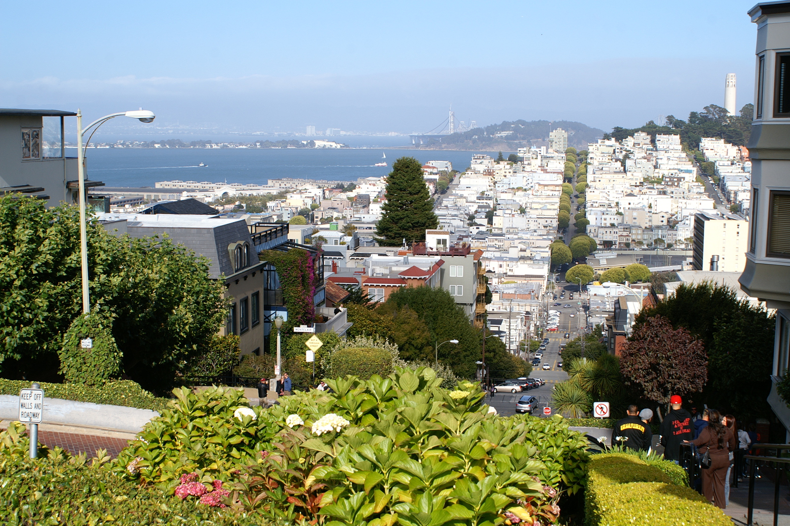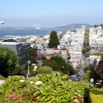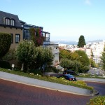 La journée n’étant pas encore terminée (il est 16h45), nous dépensons nos dernières forces dans la montée à pieds de Lombard Street, une rue particulièrement pentue (16%) et fleurie, qui offre à son sommet une vue imprenable sur la ville et la baie. Aujourd’hui, les voitures en descendent les 8 virages au pas, sans imaginer qu’avant son réaménagement en 1922, la pente était de 27% …