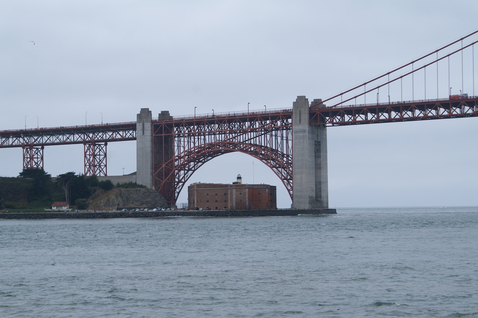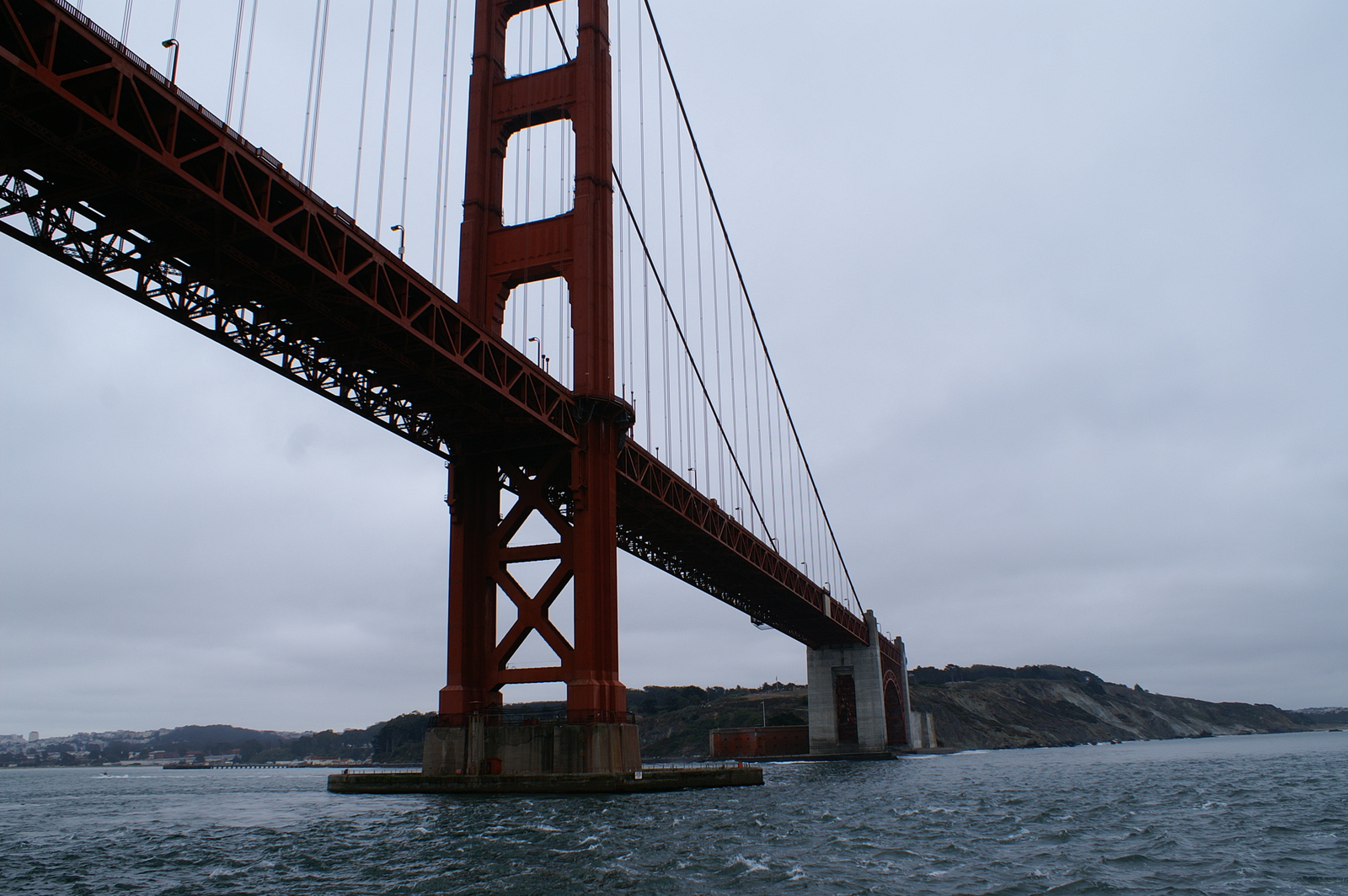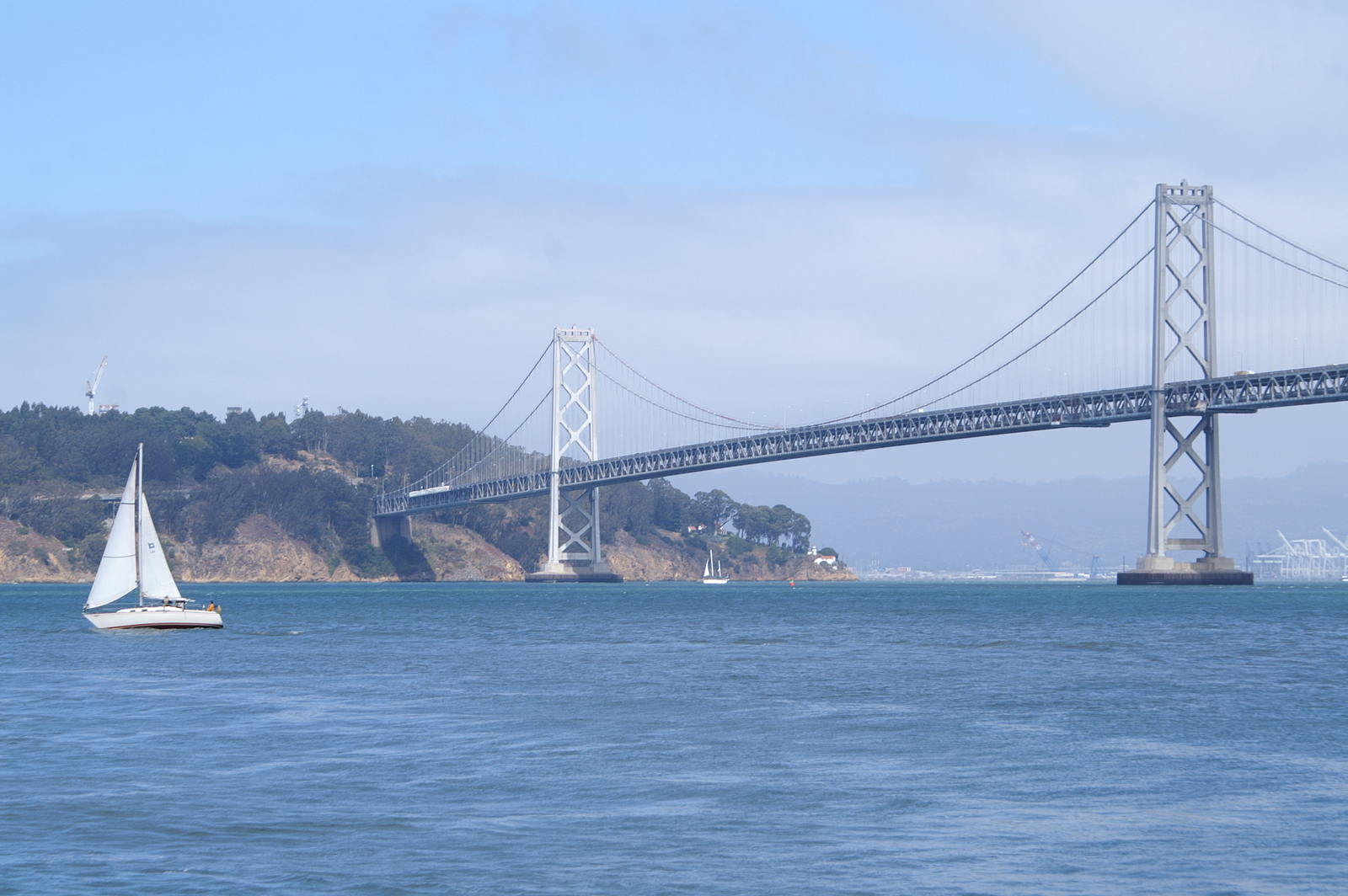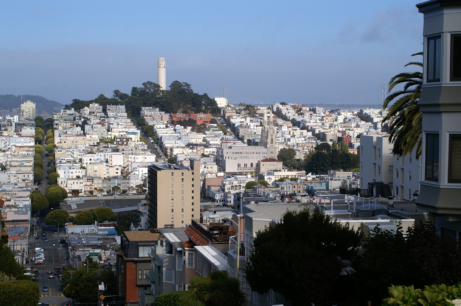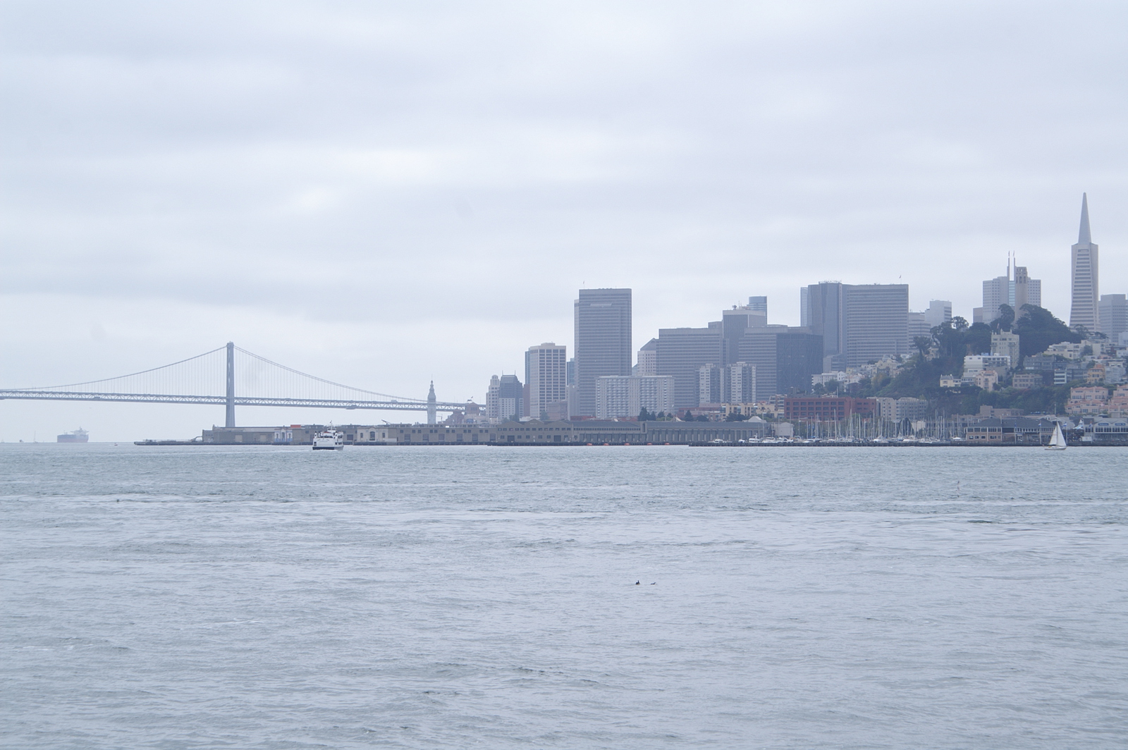 L’après-midi, la ligne California ouest de Cable Car et un premier bus nous déposent près du City Hall et du théâtre ; un second bus nous permet finalement d’atteindre Alamo Square et ses maisons victoriennes, dont la rangée des 7 « Painted Ladies » que tout photographe amateur passant par San Francisco veut immortaliser ! Dans ce quartier verdoyant perché sur une colline, nous retrouvons un peu de calme et de sérénité… Nous reprenons une dernière fois le bus pour Embarcadero, un quartier en bord de mer tout proche du Bay Bridge. Ce dernier comporte en réalité deux ponts reliés à une île centrale (Yerba Buena), dont la partie côté San Francisco supporte 2 voies de circulation superposées ; l’ensemble mesure plus de 7 km.