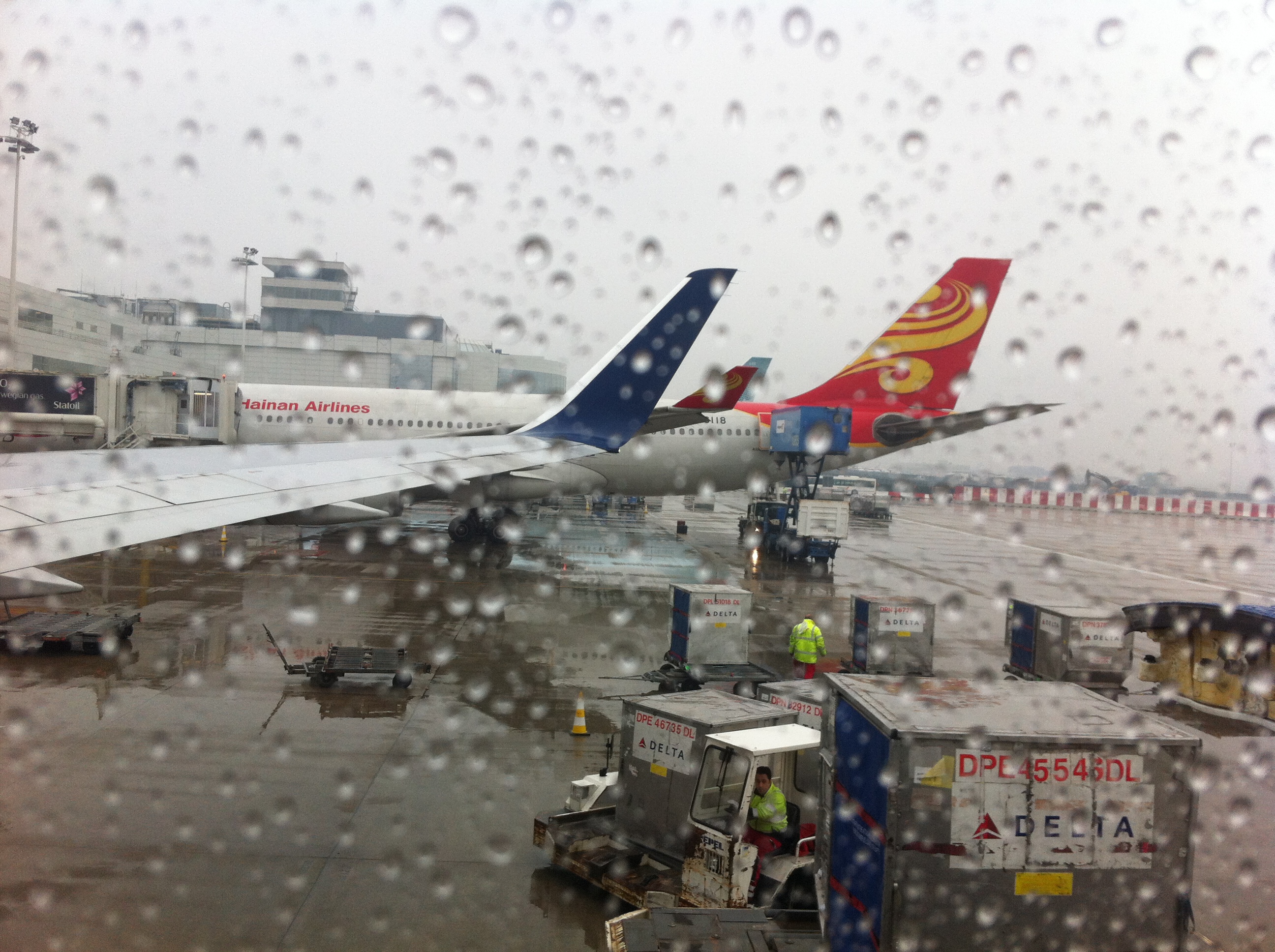 - Enregistrement pour le vol de 10h45 : n°81 effectué par Delta Airlines (B767-300-Economy= 2+3+2 sièges et pas d’écran individuel) : formalités, puis embarquement.