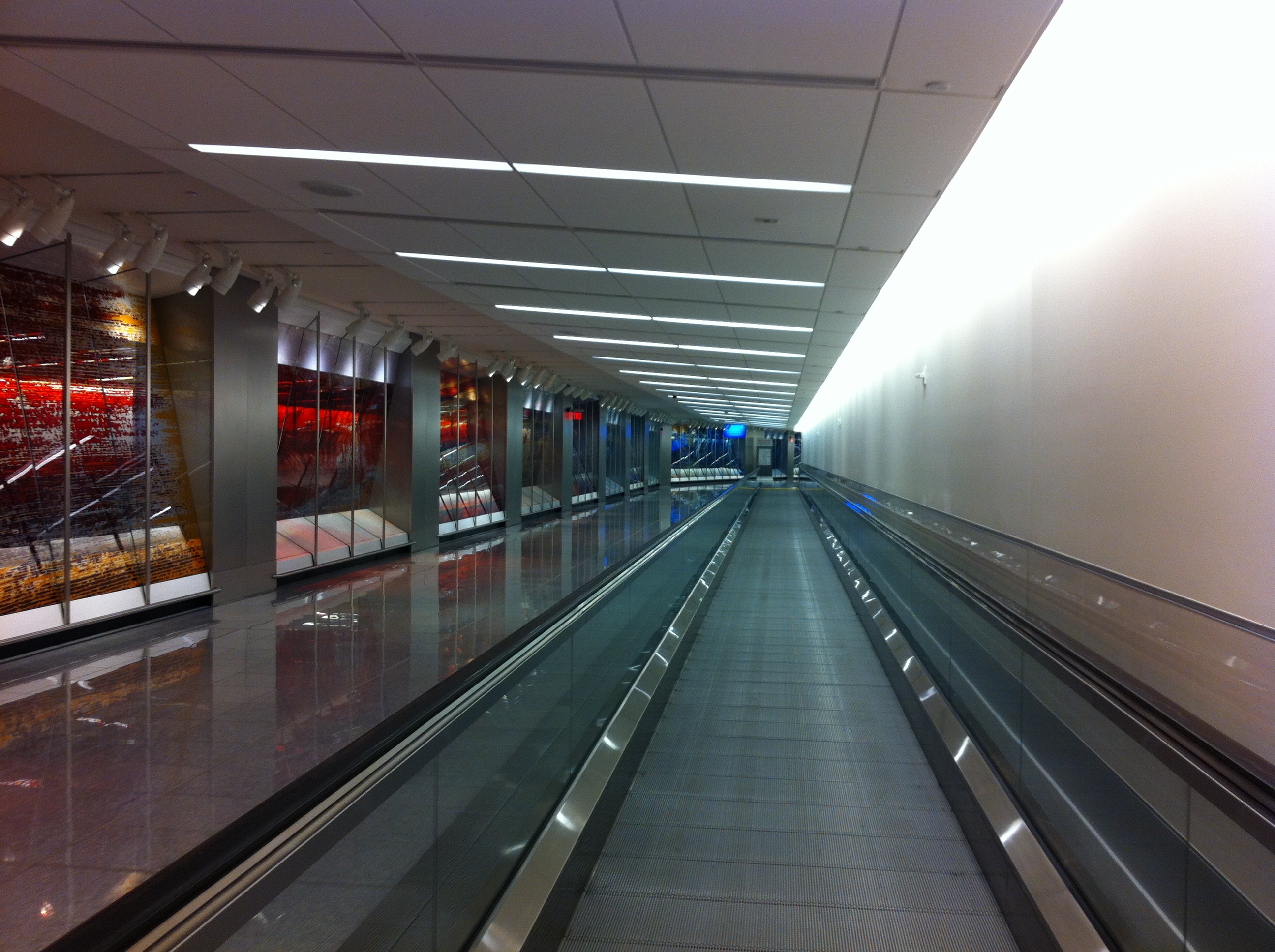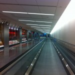 Une fois l’avion décollé, nous avons vite laissé derrière nous la pluie et le froid (à peine 10°C contre 25 la veille) pour des conditions plus clémentes à Atlanta : un grand soleil et une température agréable de 23°C. Après avoir parcouru un dédale d’interminables couloirs déserts menant aux comptoirs de l’immigration, nous retrouvons la foule qui nous y précède ; ce passage obligatoire n’aura finalement duré « que » 1h15.
