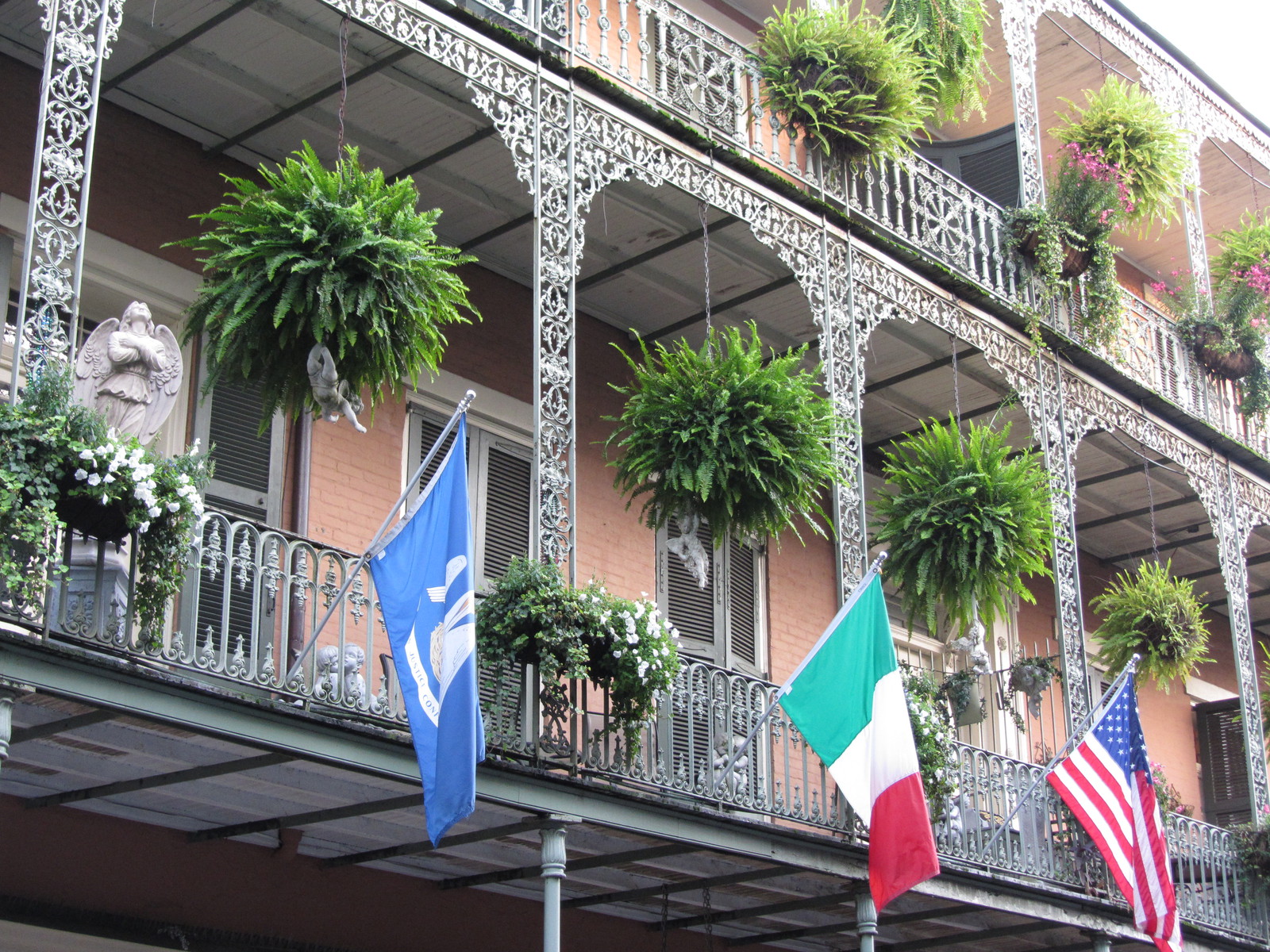 Nous finissons par entrer en Lousiane par l’I.10, qui comporte de nombreuses sections sur pilotis dont un pont de 9 km au dessus du Lac Pontchartrain (plus de 1800 km²). La première découverte de la Nouvelle Orléans nous laisse une impression mitigée… Dans le « quartier français », le calme relatif de la Royal Street est propice à la contemplation des maisons typiques aux balcons en fer forgé ouvragés ; c’est tout l’inverse dans la rue parallèle, Bourbon Street, où les nombreux bars et clubs suscitent une agitation fébrile, bruyante et pas toujours de bon goût.