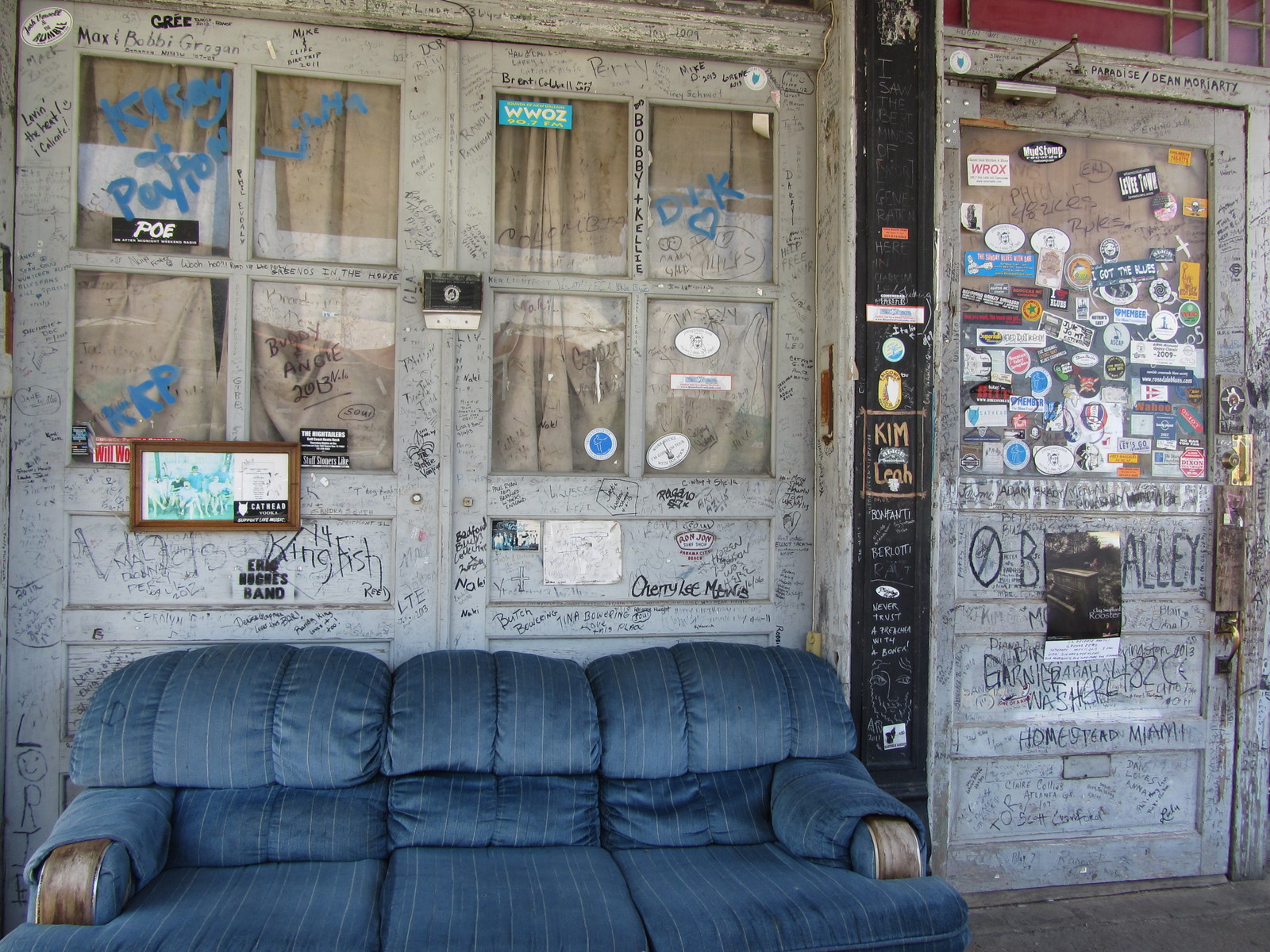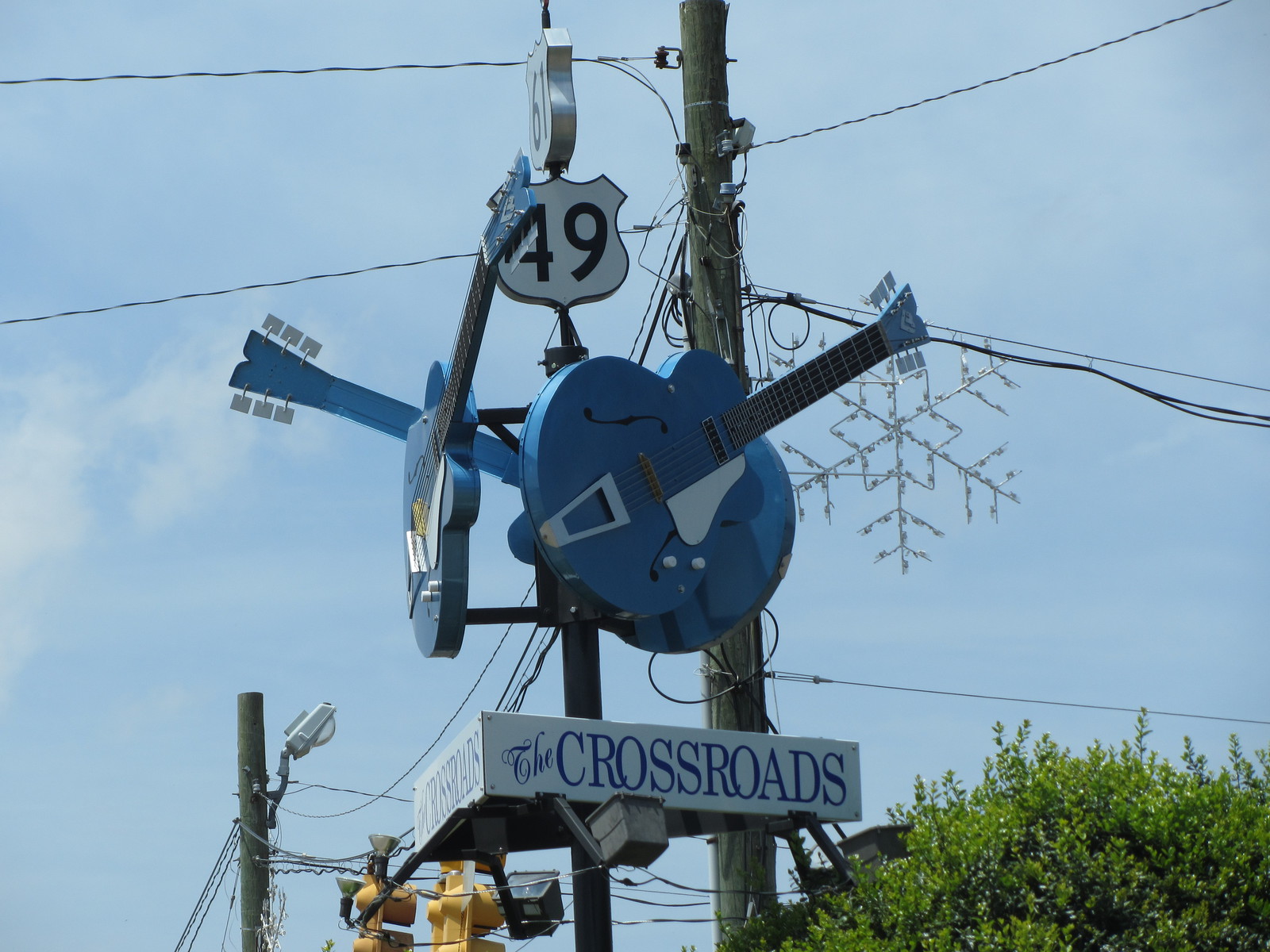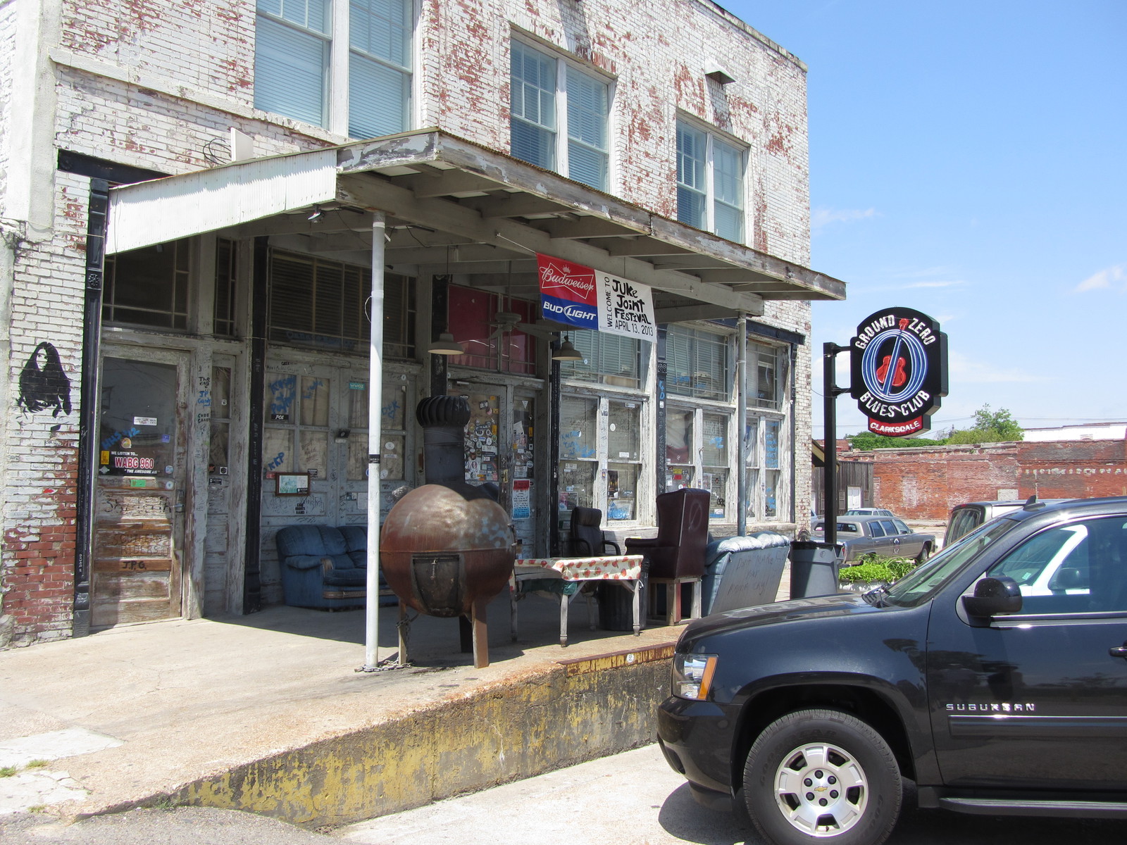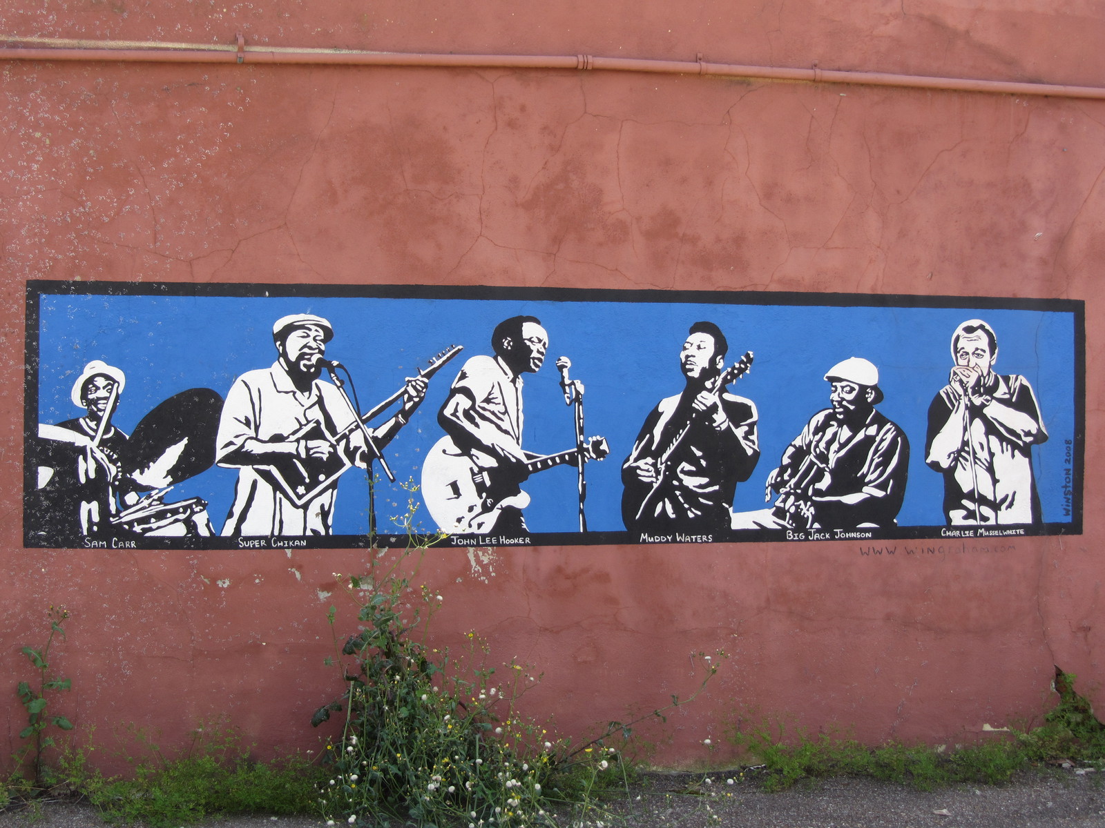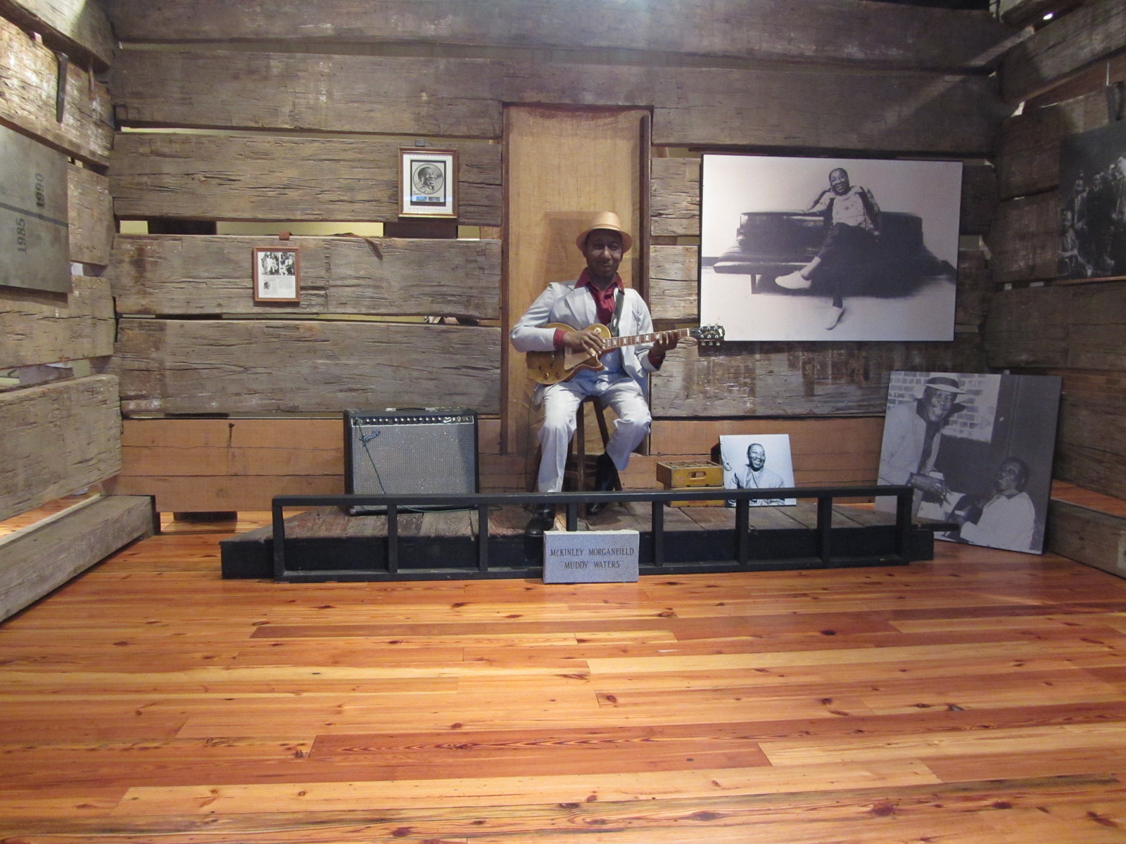 Suite aux péripéties de la veille au soir, nous quittons l’Arkansas (sans l’avoir visité) pour rejoindre la route 61 jusque Clarksdale dans l’état du Mississippi. Cette petite ville est un haut lieu du blues : on y trouve de sombres « juke joints » (clubs de blues où peu de blancs s’aventurent), des clubs-bars plus connus mais pas forcément plus engageants, tels que le Ground Zero de Morgan Freeman, ou encore le carrefour des routes 49 et 61 dit « the Crossroads » où, selon la légende, Robert Johnson aurait vendu son âme au diable… Le Delta Blues Museum rassemble un éventail de guitares, costumes et objets des bluesmen de la région, notamment Muddy Waters qui y occupe une place de choix. Au détour de certaines rues peu reluisantes (l’envers du décor et la réalité sociale sont aussi à voir…), comme à Leland, le visiteur de passage tombe sur des fresques murales généralement bien colorées.