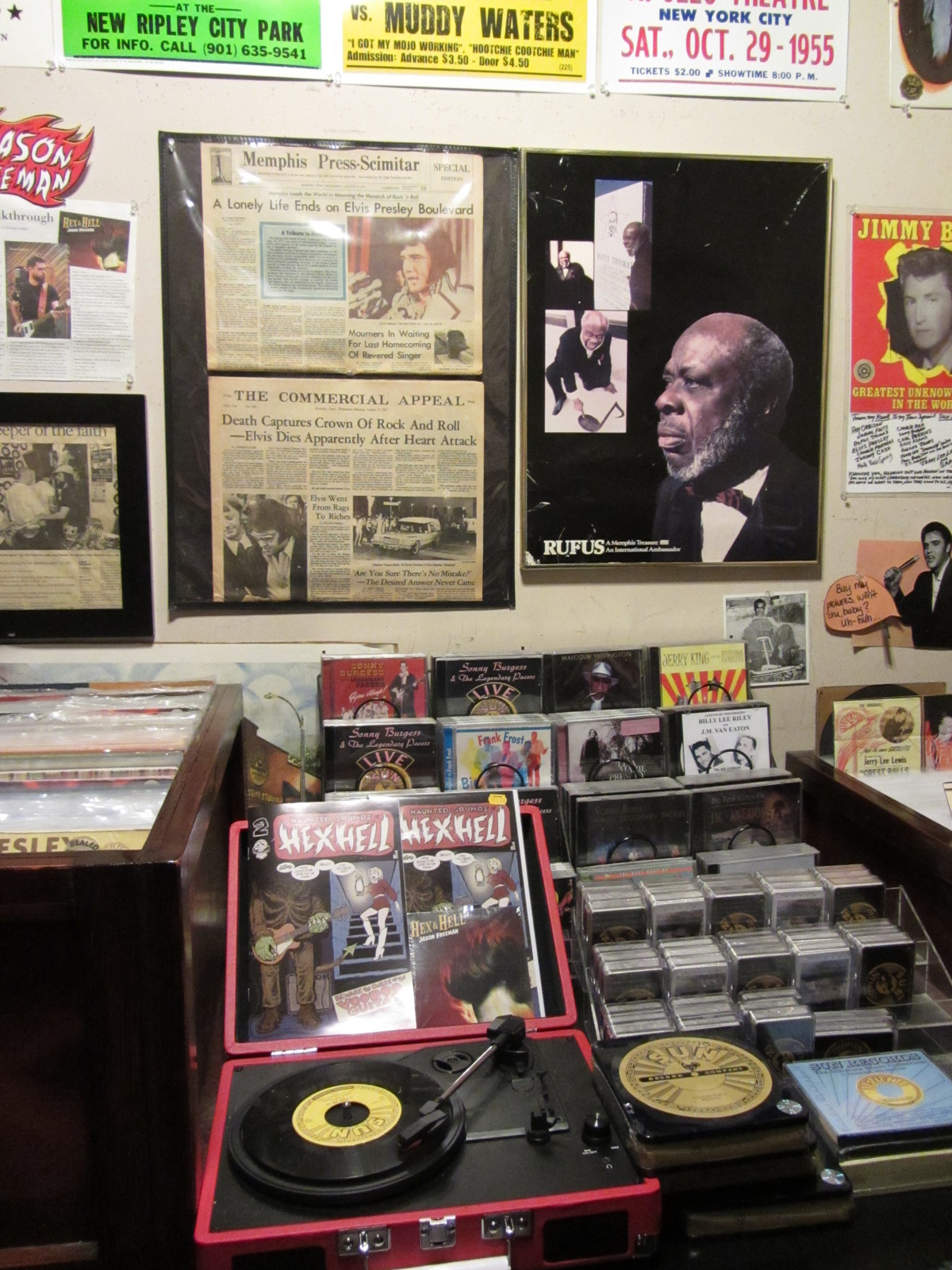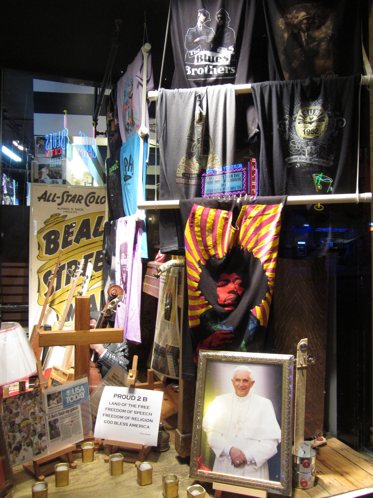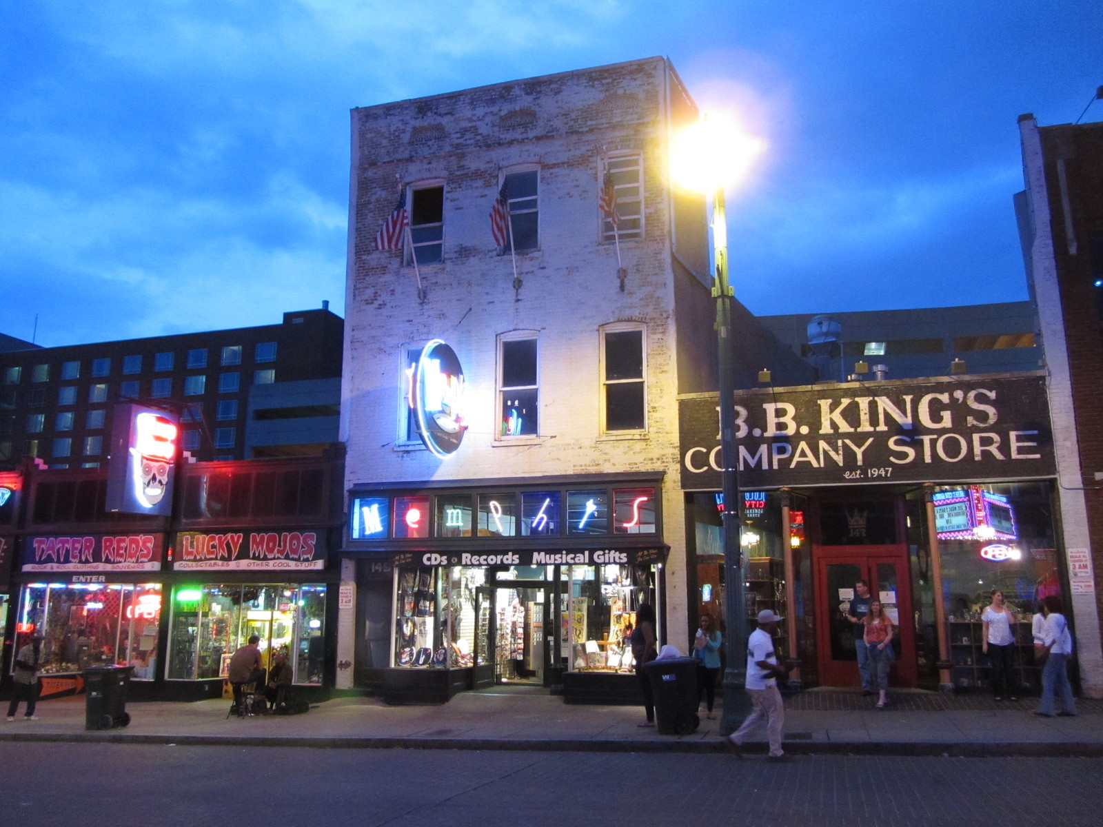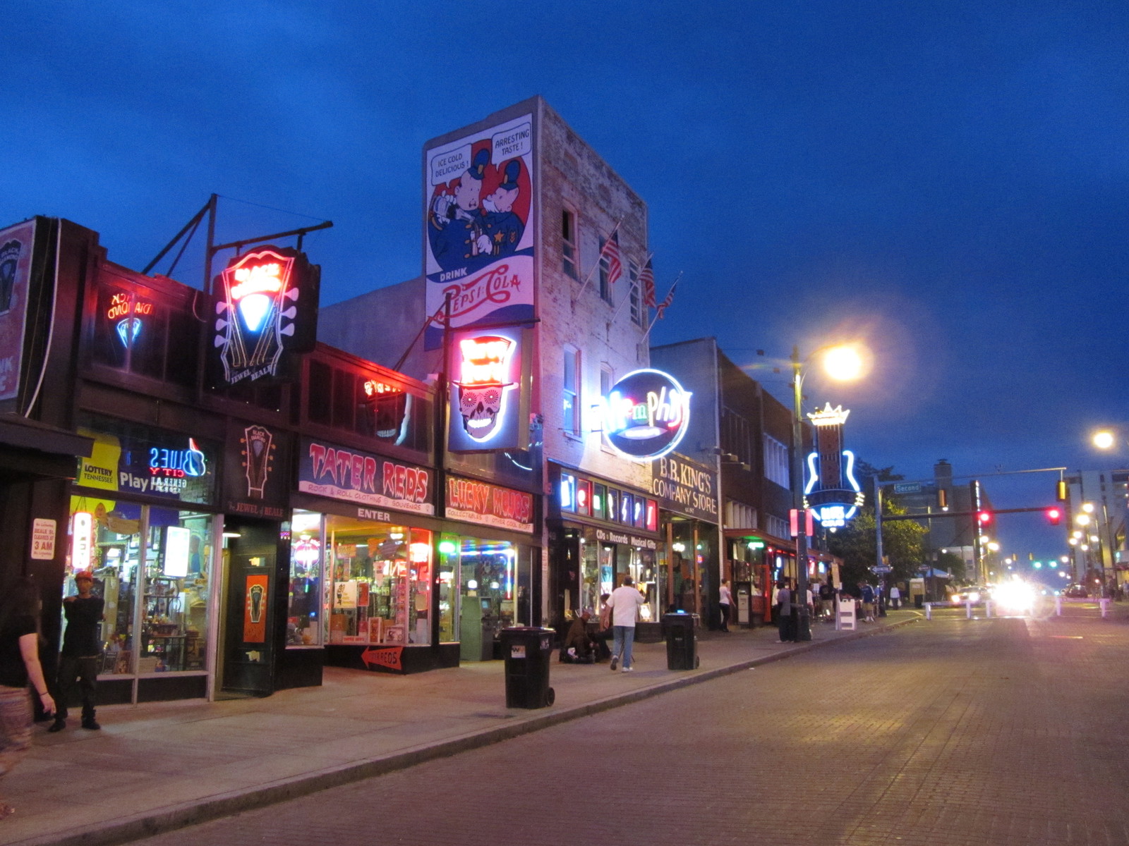 Nous déambulerons ensuite dans la célèbre Beale Street, où de nombreux groupes se produisent dans les bars et restaurants. Bien que cette rue piétonne soit nettement moins étendue que la Bourbon Street de la Nouvelle Orléans, l’ambiance y semble plus « soft » et les musiciens de meilleure qualité (mais ce n’est que notre avis de touriste de passage). Dans certaines boutiques, on s’étonnera à peine de trouver une icône du Pape à côté de celle de Jimmy Hendrix et de lunettes de WC rock’n’roll.