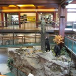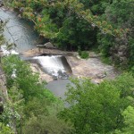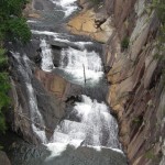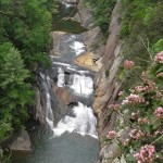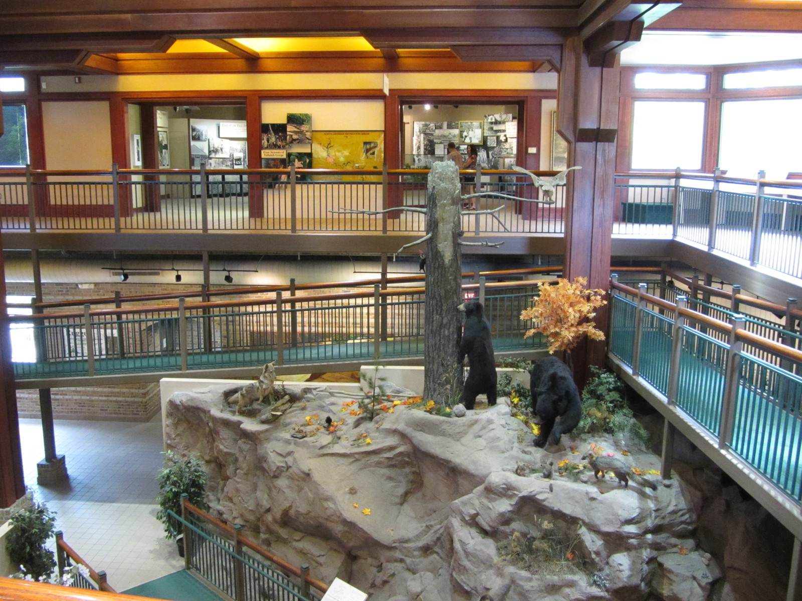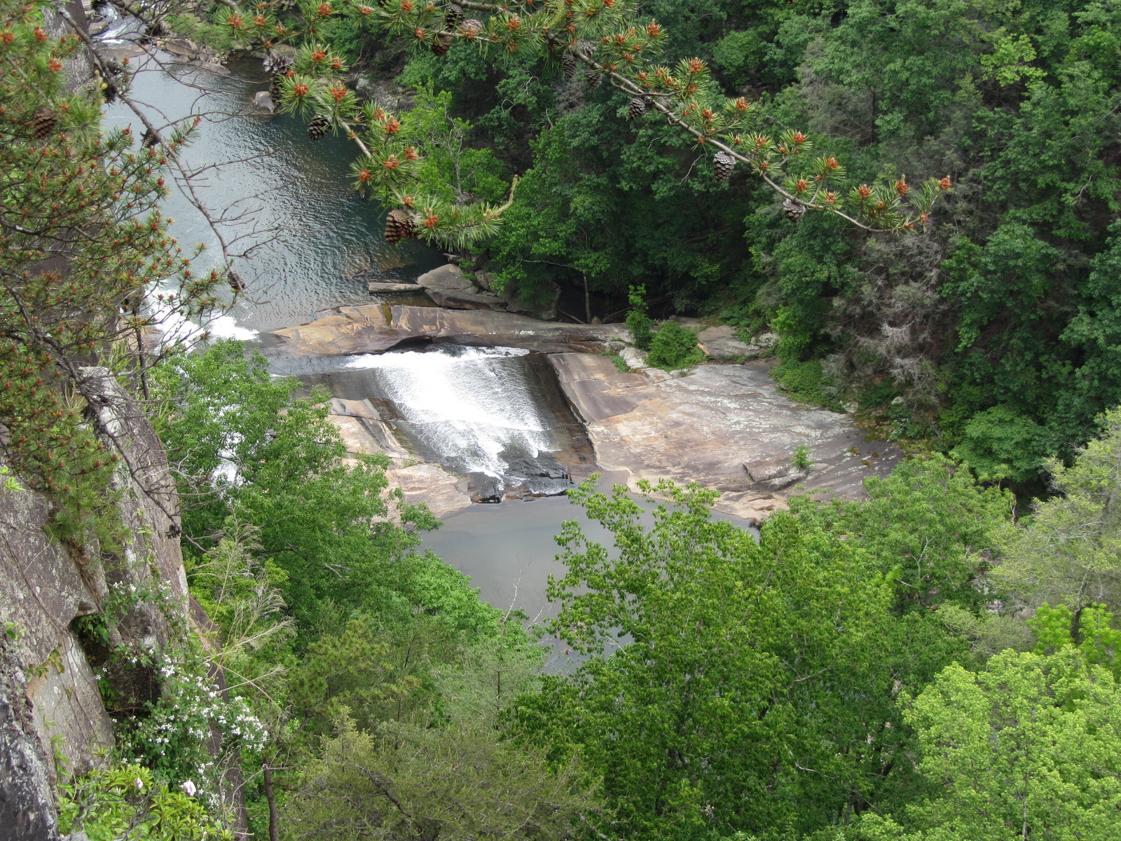 Tant pis, nous décidons d’avancer vers Tallulah Gorge State Park, que nous n’avons choisi que parce qu’il figure sur la carte. Nous y découvrons un intéressant « Interpretive Center » où une vidéo de 15 minutes présente la nature environnante et les chutes d’eau du parc. Différentes expositions mettent en scène la faune et la flore locale, et racontent les activités humaines telles que la construction d’un barrage hydroélectrique ou l’arrivée du chemin de fer. Deux courtes balades permettent d’accéder aux points de vue les plus proches sur les chutes d’eau, sans devoir entamer une longue descente de 1099 marches ou une dangereuse randonnée sur les rochers glissants. Cet arrêt à mi-chemin (en temps) nous permet de souffler dans un cadre agréable.